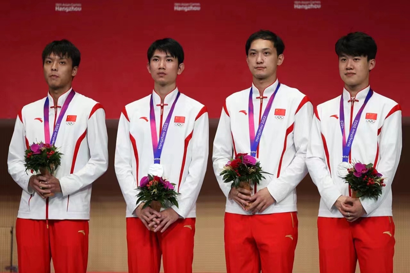 9月28日,男子佩剑团体赛开赛,沈晨鹏和其他三位队友代表中国队经过数轮激烈的比拼,一路过关斩将,收获男子佩剑团体银牌。
