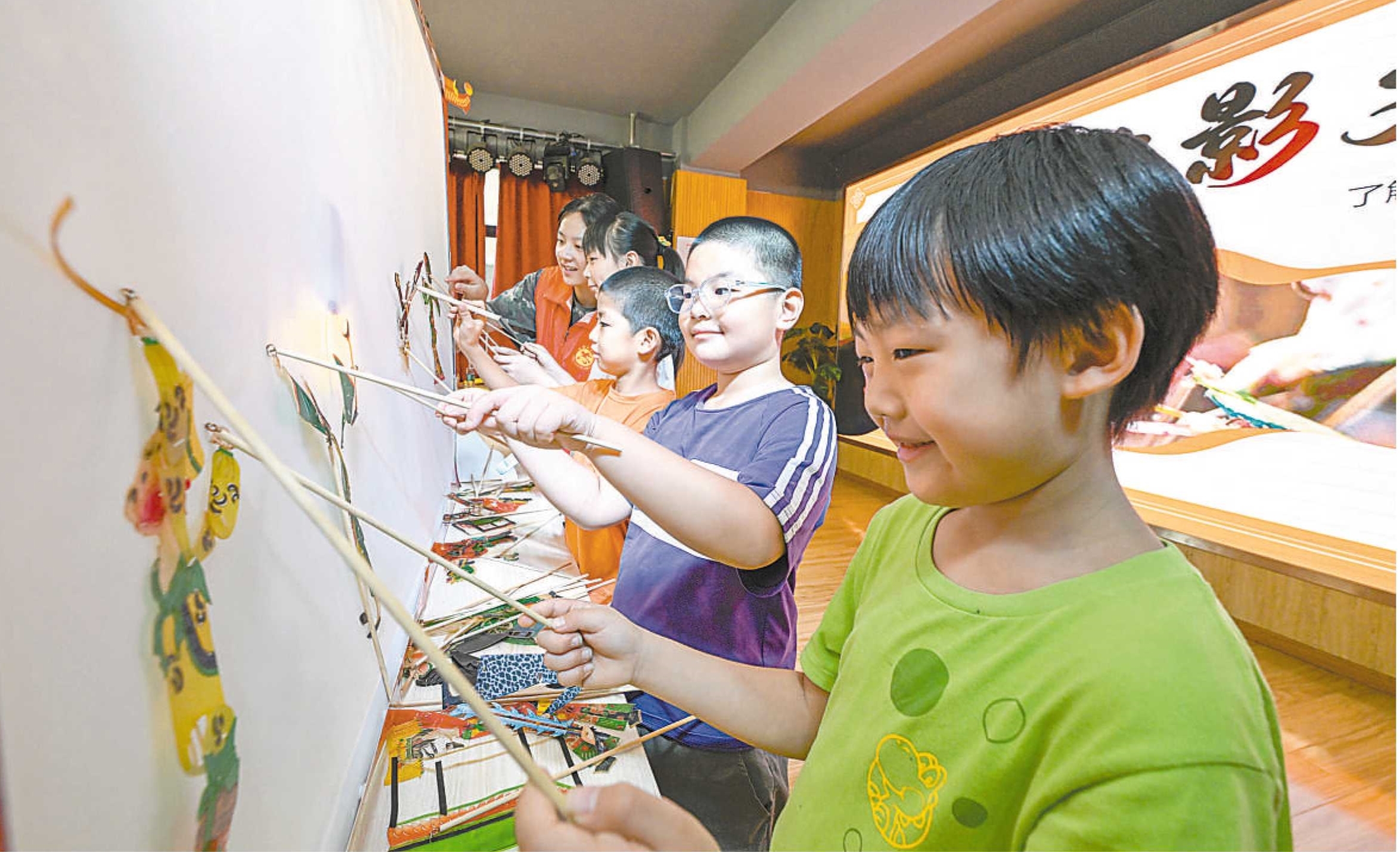 7月15日,在合肥市庐阳区双岗街道小桥湾党群服务中心,孩子们正在公益暑托班上学习演绎非遗皮影戏。赵明 摄