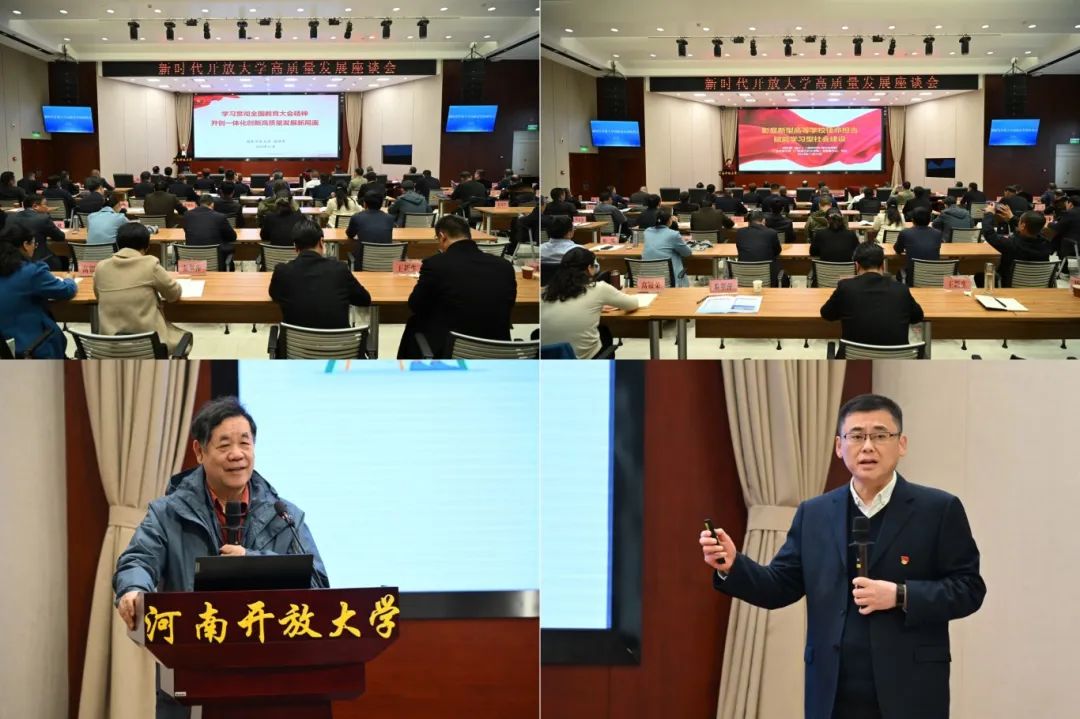11月23日上午,新时代河南开放大学高质量发展座谈会在河南开放大学龙子湖校区召开。河南省教育厅副厅长刘林亚,国家开放大学党委副书记徐明军,广东开放大学党委副书记、校长刘文清,华东师范大学原网络教育学院院长祝智庭,中国石油大学(华东)教育发展中心党委书记马国刚出席会议。会议由河南开放大学党委副书记、工会主席王继东主持。