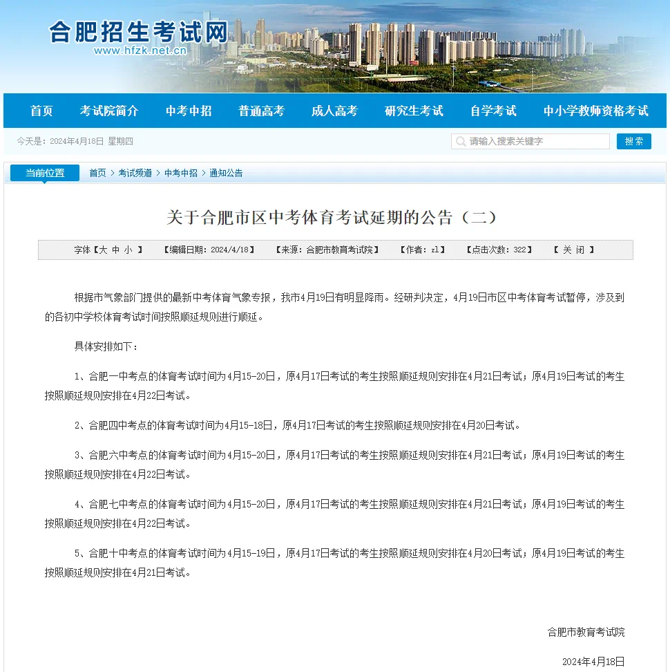 2、合肥四中考点的体育考试时间为4月15-18日,原4月17日考试的考生按照顺延规则安排在4月20日考试。