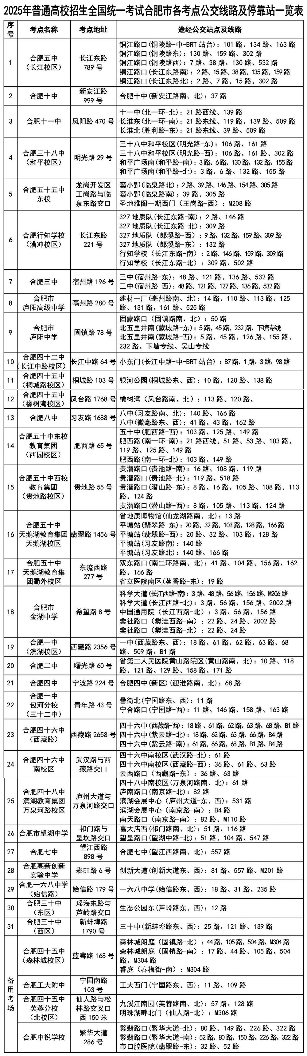 为方便广大考生高考期间顺利出行,合肥公交集团逐一列出途经省城31个考点及4个备用考点的公交线路、停靠站点,方便考生乘坐公交车赶赴考场应试。