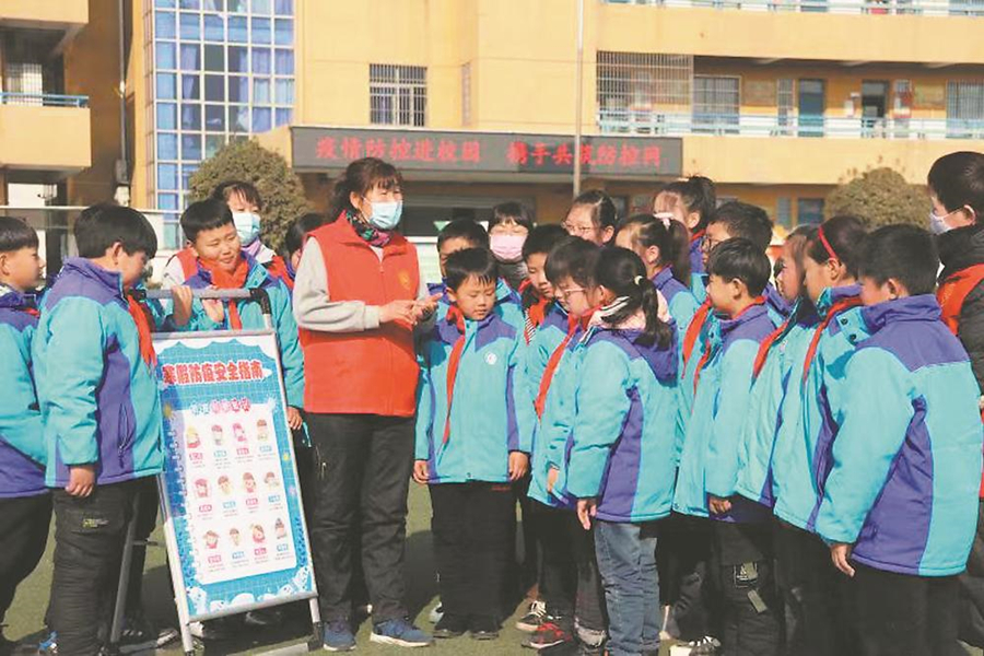 寒假前,亳州市谯城区汤陵街道灵津渡社区联合拂晓中心小学,组织社区党员志愿者走进校园,共同开展疫情防控知识宣传活动,进一步强化学生们的疫情防控意识,号召大家养成良好的卫生习惯,并携手家人共同遵守疫情防控相关规定,做到不聚集、不扎堆,春节期间尽量不走亲访友。通讯员 王飞 师心魁 摄