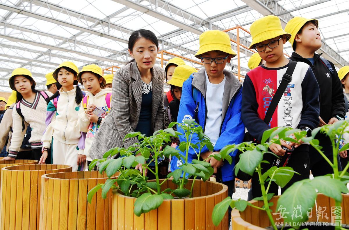 11月20日,肥东县欢乐森林景区现代农业研学游馆,孩子们在老师带领下体验立体基质盆栽农作物种植,在实践中学习现代农业知识。