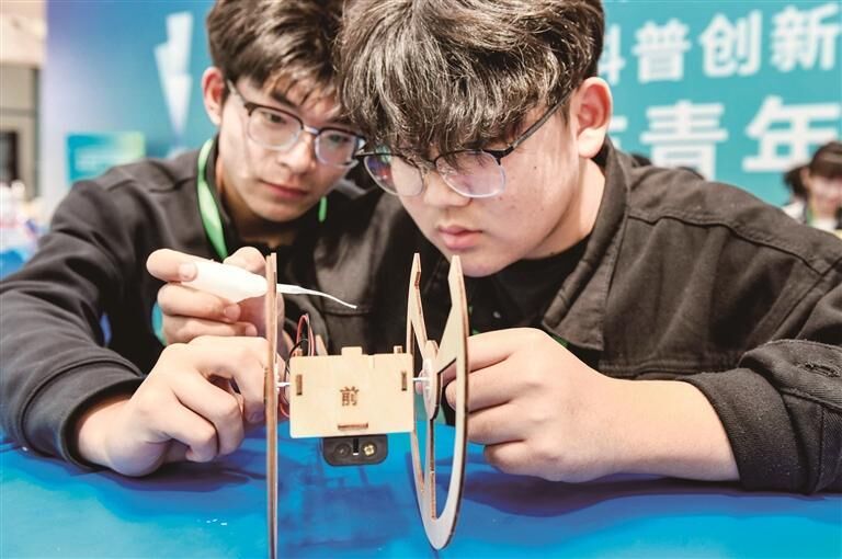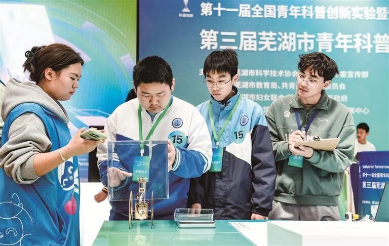 4月13日,第十一届全国青年科普创新实验暨作品大赛安徽赛区芜湖市分赛区暨第三届芜湖市青年科普创新实验暨作品大赛,吸引了众多青少年选手参赛。一款款由选手创意打造的未来“太空车”纷纷亮相,并在完成“太空任务”中角逐高低。(记者 吴敏 文 吴安亚 摄)