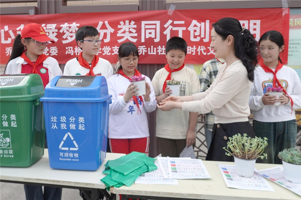 4月17日,马鞍山市花山区江东街道乔山社区党委联合冯桥小学,组织网格员、志愿者以及师生开展垃圾分类宣传活动,培养学生们的环保意识。通讯员 胡智慧 程玉 摄