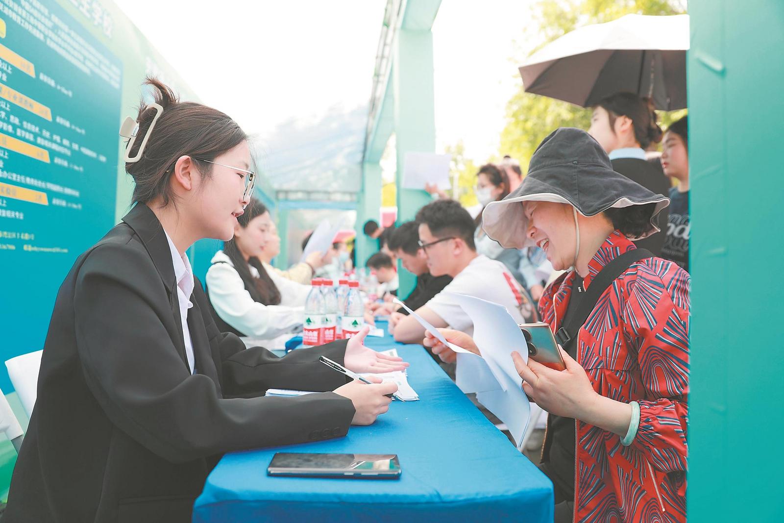 2025年4月26日,众多求职者在安徽省芜湖市神山公园“2025年芜湖市菁英人才春季招聘会”现场求职。 通讯员 陈效宝 摄