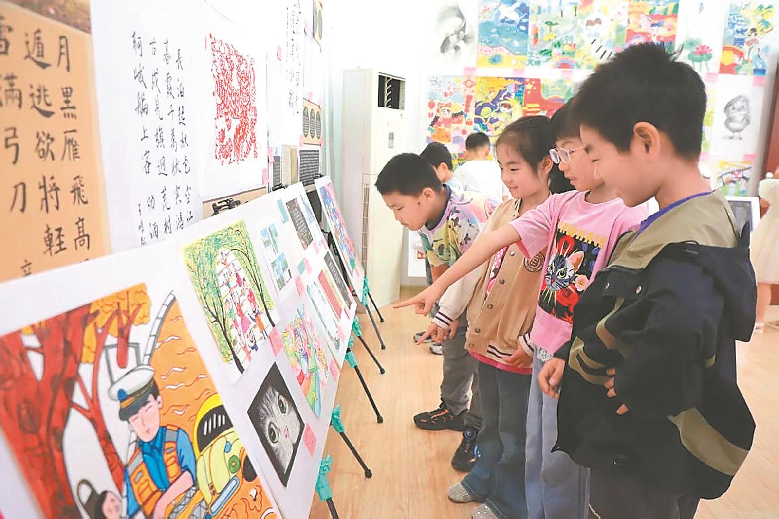 5月25日,宿州市埇桥区文化馆内,孩子们在观看少年儿童书画作品。通讯员 张成伍 李燕 摄