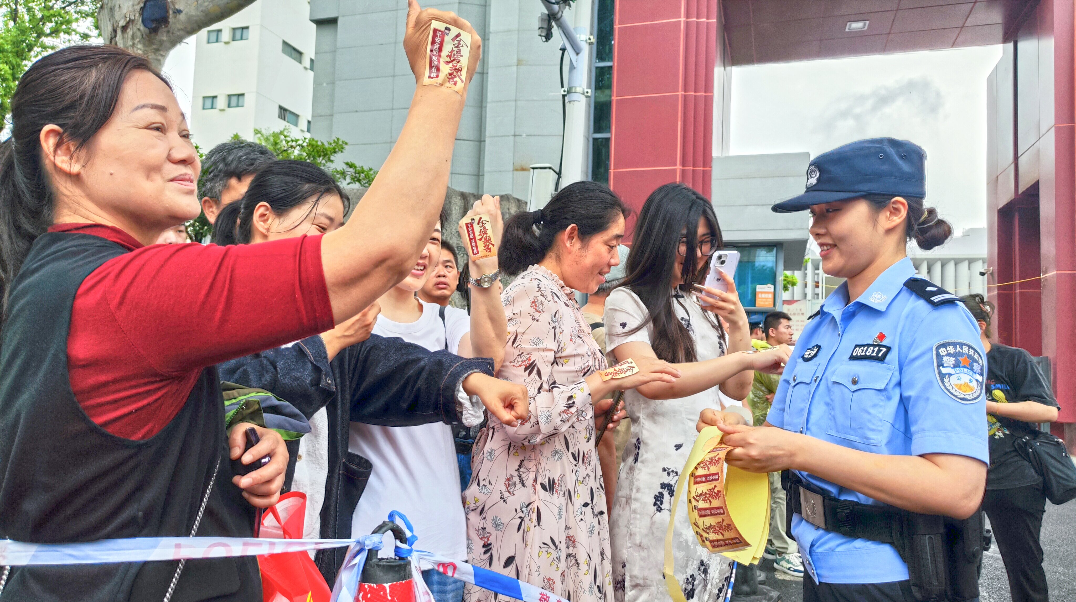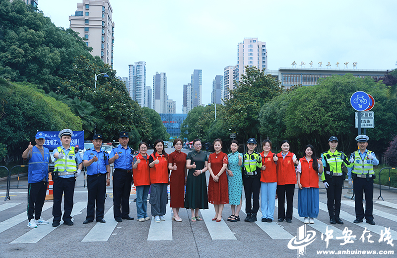 6月7日,在合肥五十中天鹅湖校区考场外,穿旗袍的家长和维持考场秩序的交警、志愿者们共同为考生加油。
