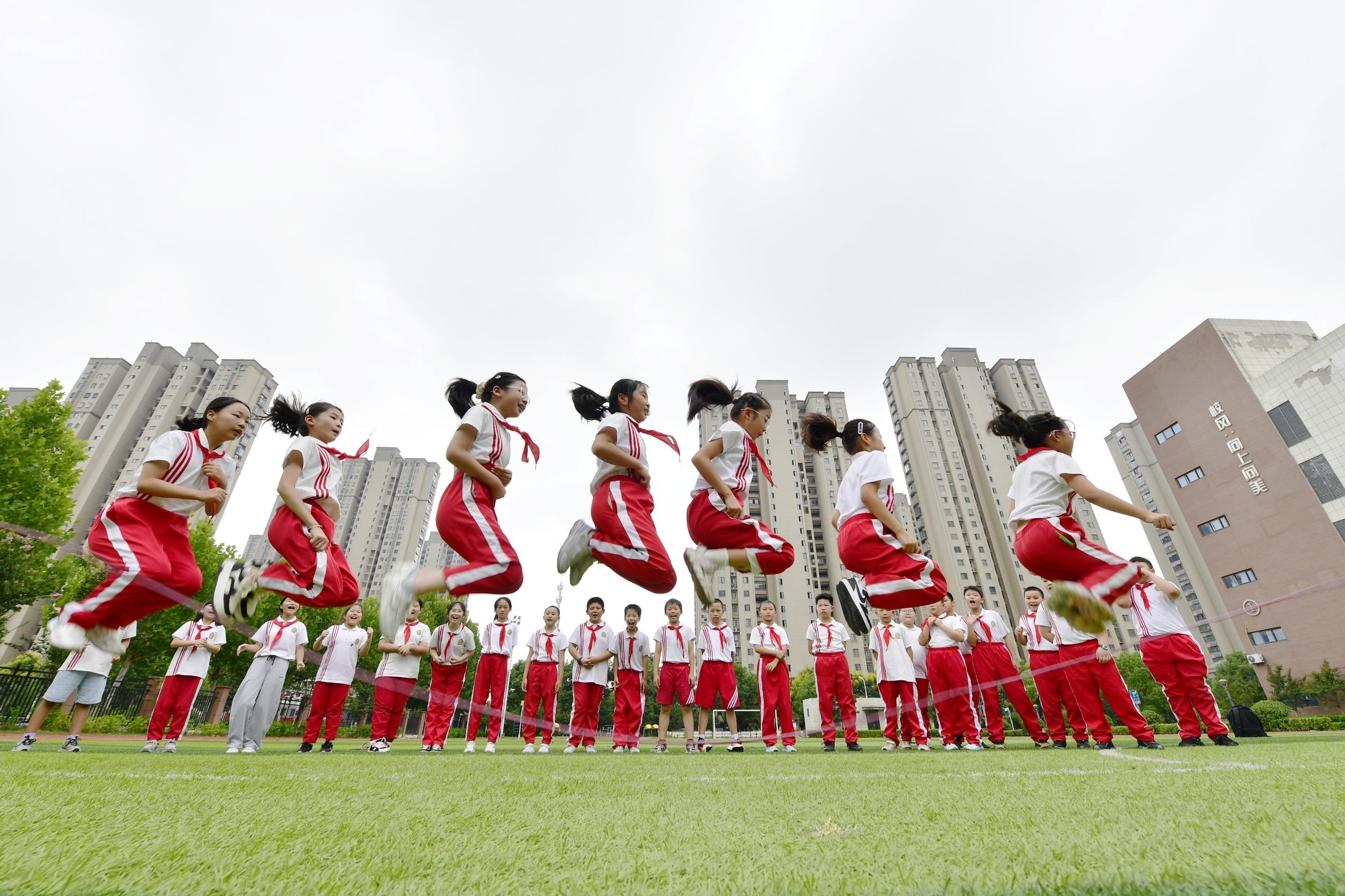 9月11日,在合肥市安居苑小学教育集团西城校区,学生在课间进行趣味活动。该校结合学生兴趣,精心策划了抖空竹、抽陀螺、竹竿舞、跳大绳、滚铁环等丰富多彩的趣味活动。同时,制定了“1+2+N”活动体系,即每天一节体育课、两个30分钟大课间、多个15分钟小课间,以“小课间”撬动“大成长”,让学生真正“走出来、动起来、乐起来”。(葛宜年 摄/视觉安徽)