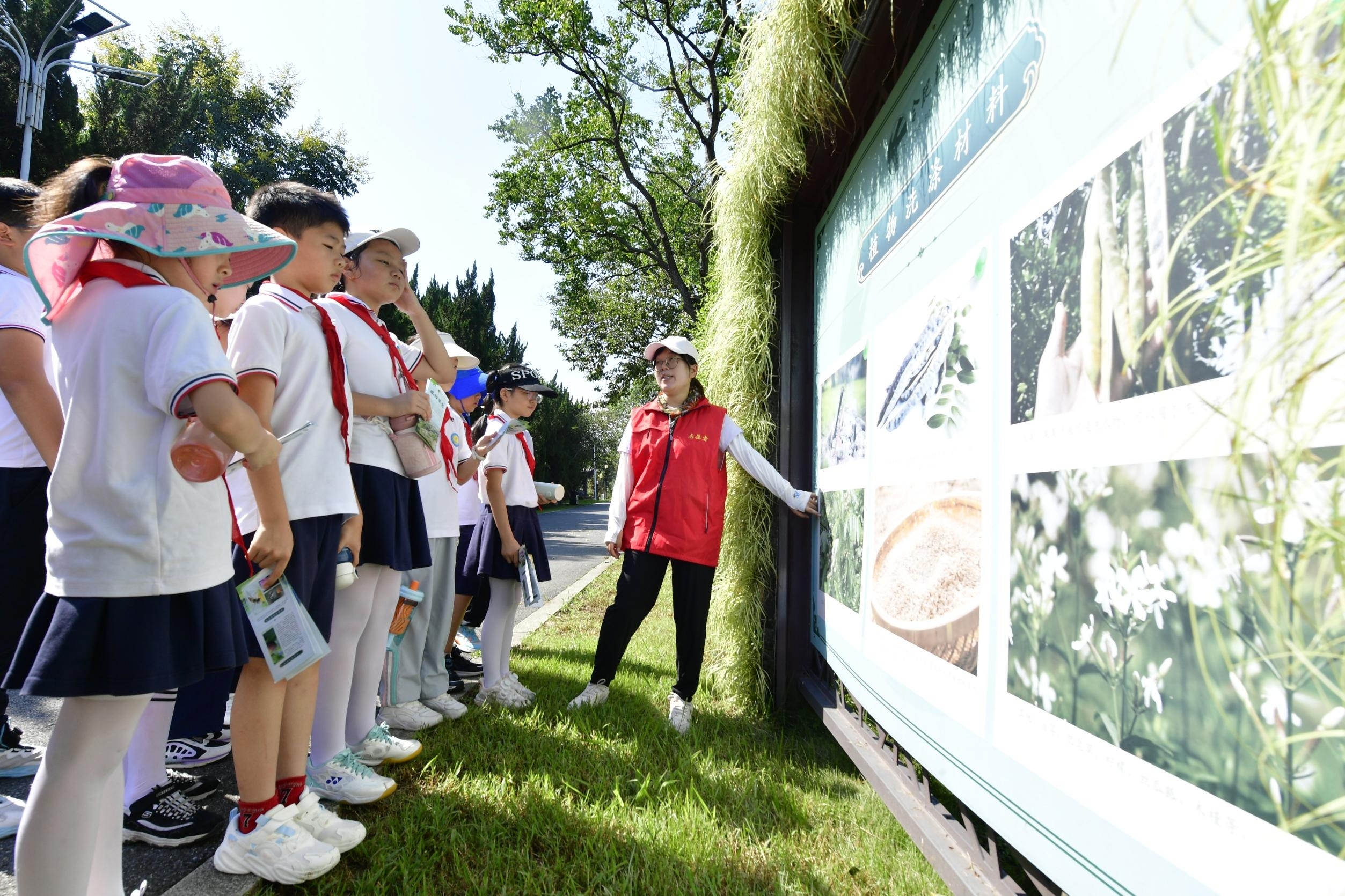 9月16日,在合肥植物园里,志愿者在向青少年介绍植物洗涤材料等知识。当日,合肥市蜀山区井岗镇卫楼社区组织辖区青少年在合肥植物园开展“植物科普”活动,通过实物图片、趣味故事和互动问答等形式,在寓教于乐中点燃孩子们探索自然的兴趣与科学梦想。(通讯员 胡凤娇 葛宜年 摄/视觉安徽)
