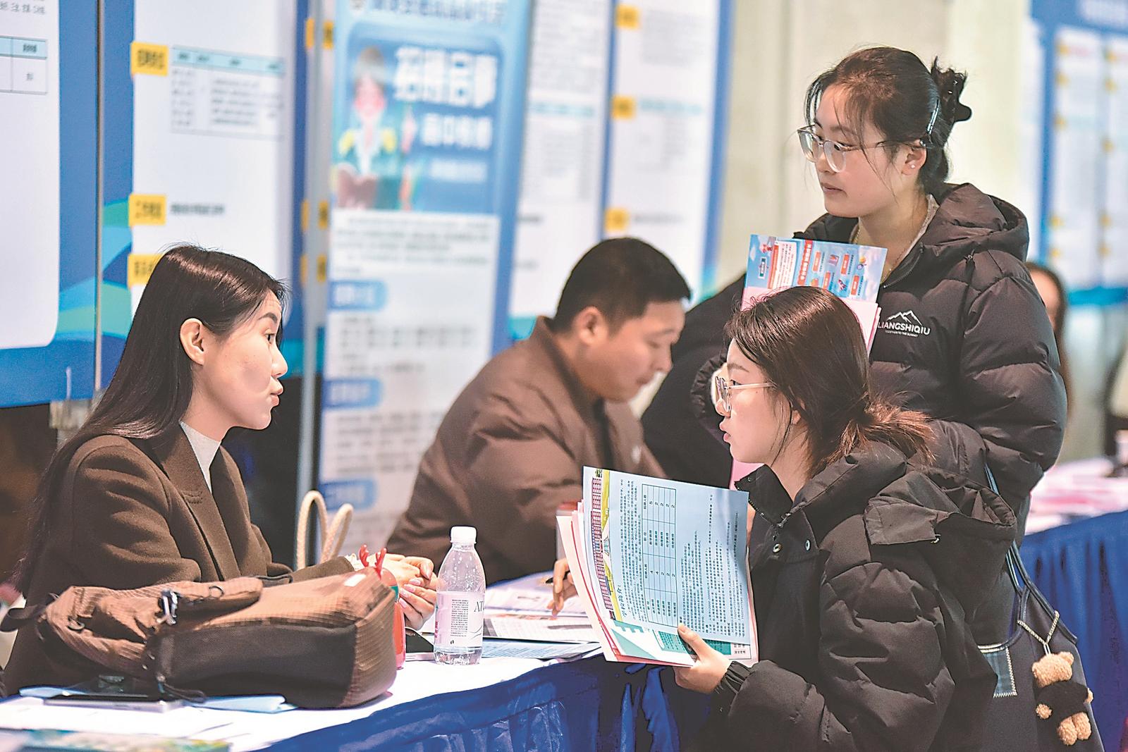 12月6日,阜阳市2025年“招才引智高校行”本地高校联合招聘会在阜阳师范大学体育中心举行。招聘会采用线上线下的方式同步进行,300余家优质单位参会,提供了6000多个就业岗位,吸引大批即将毕业的大学生咨询应聘。图为大学生与用人单位沟通。通讯员 卢启建 摄