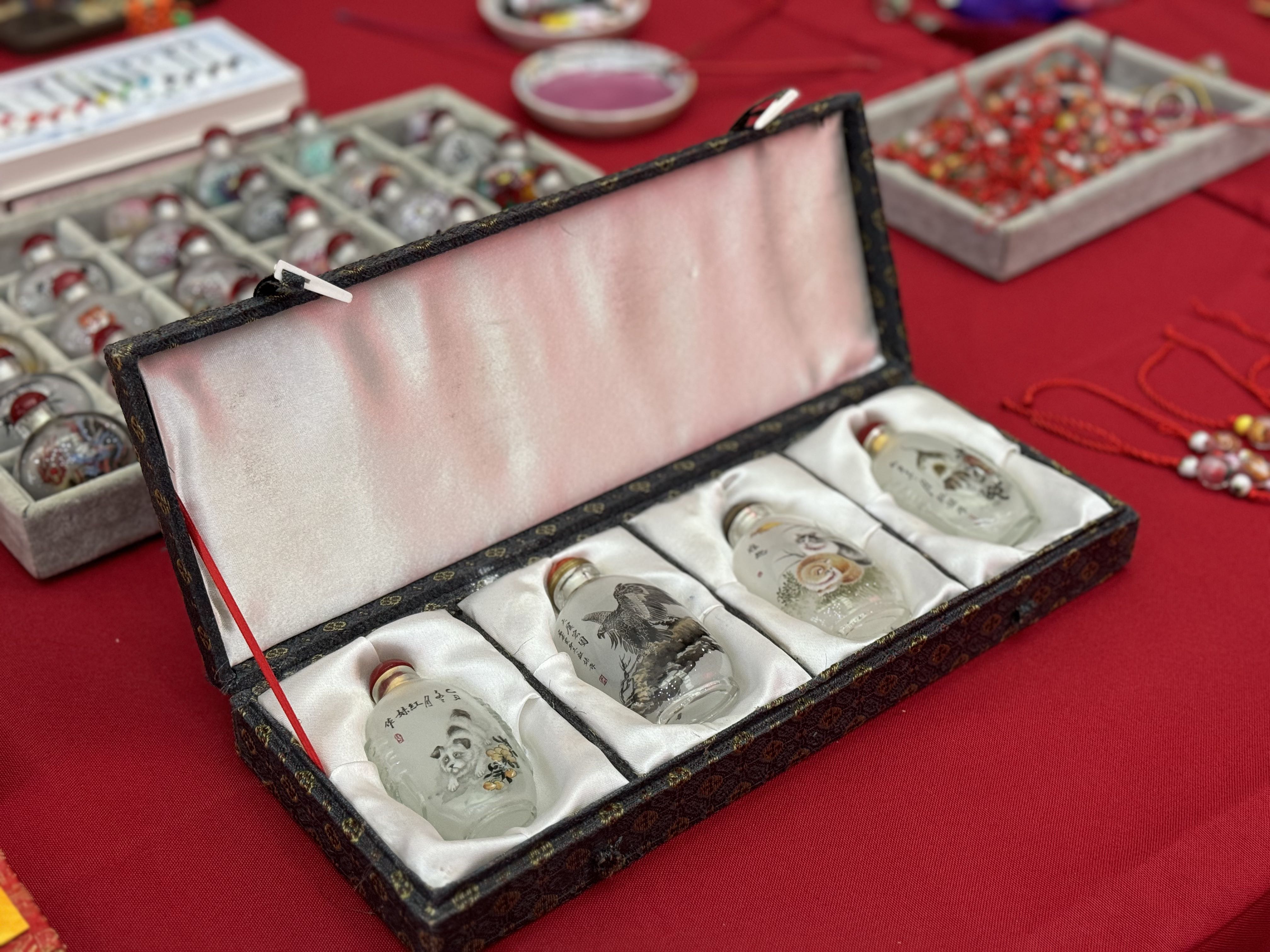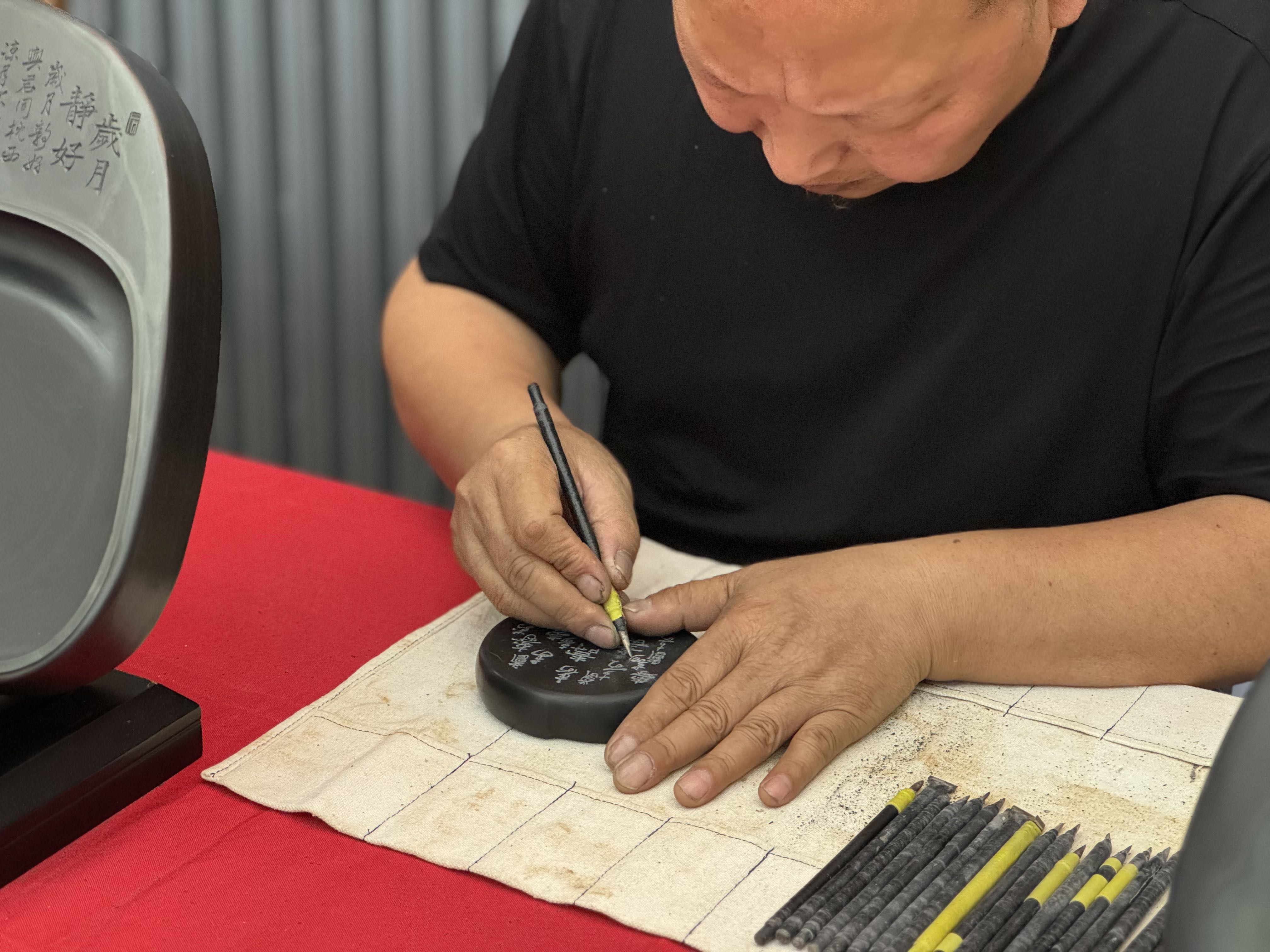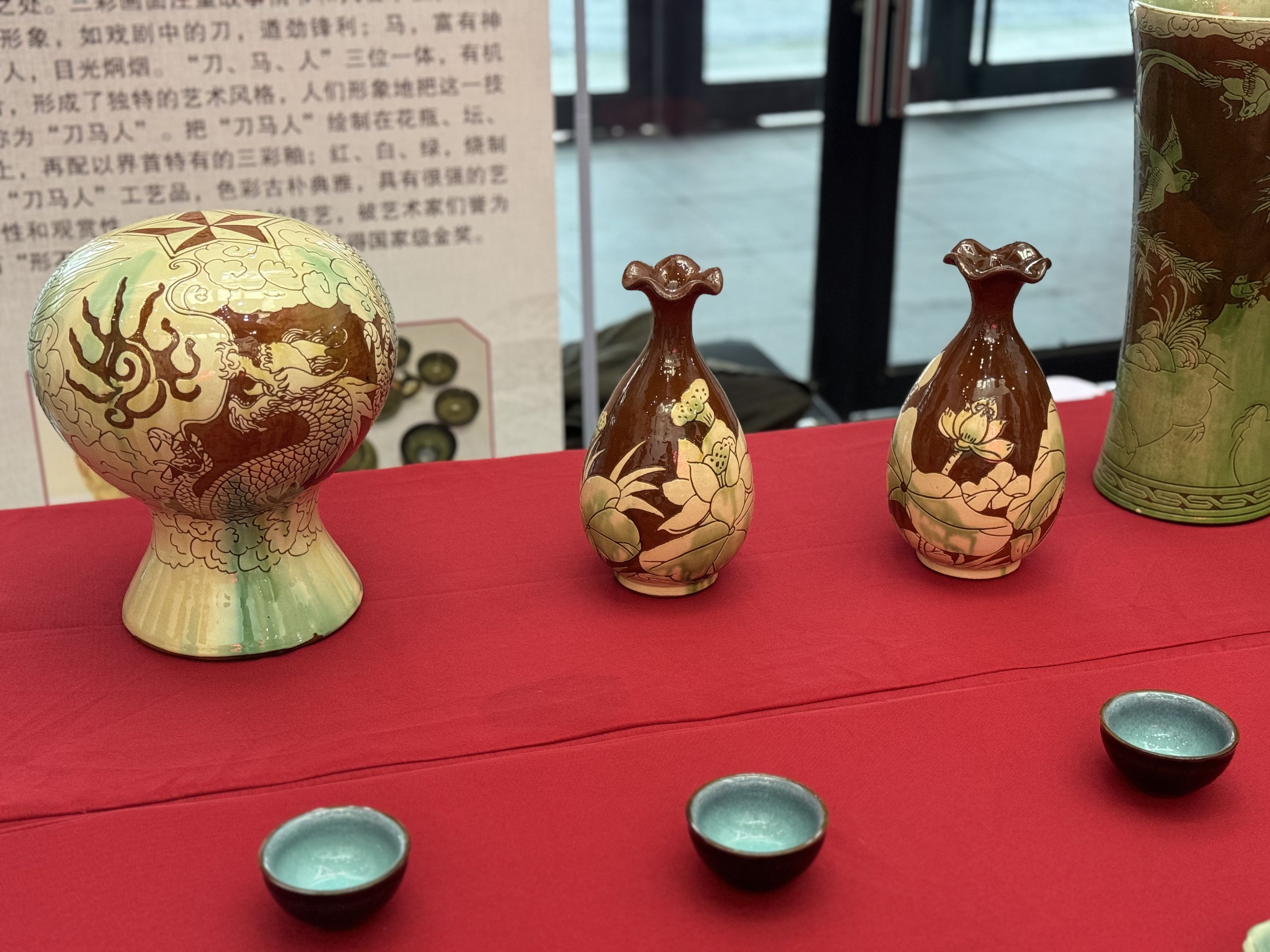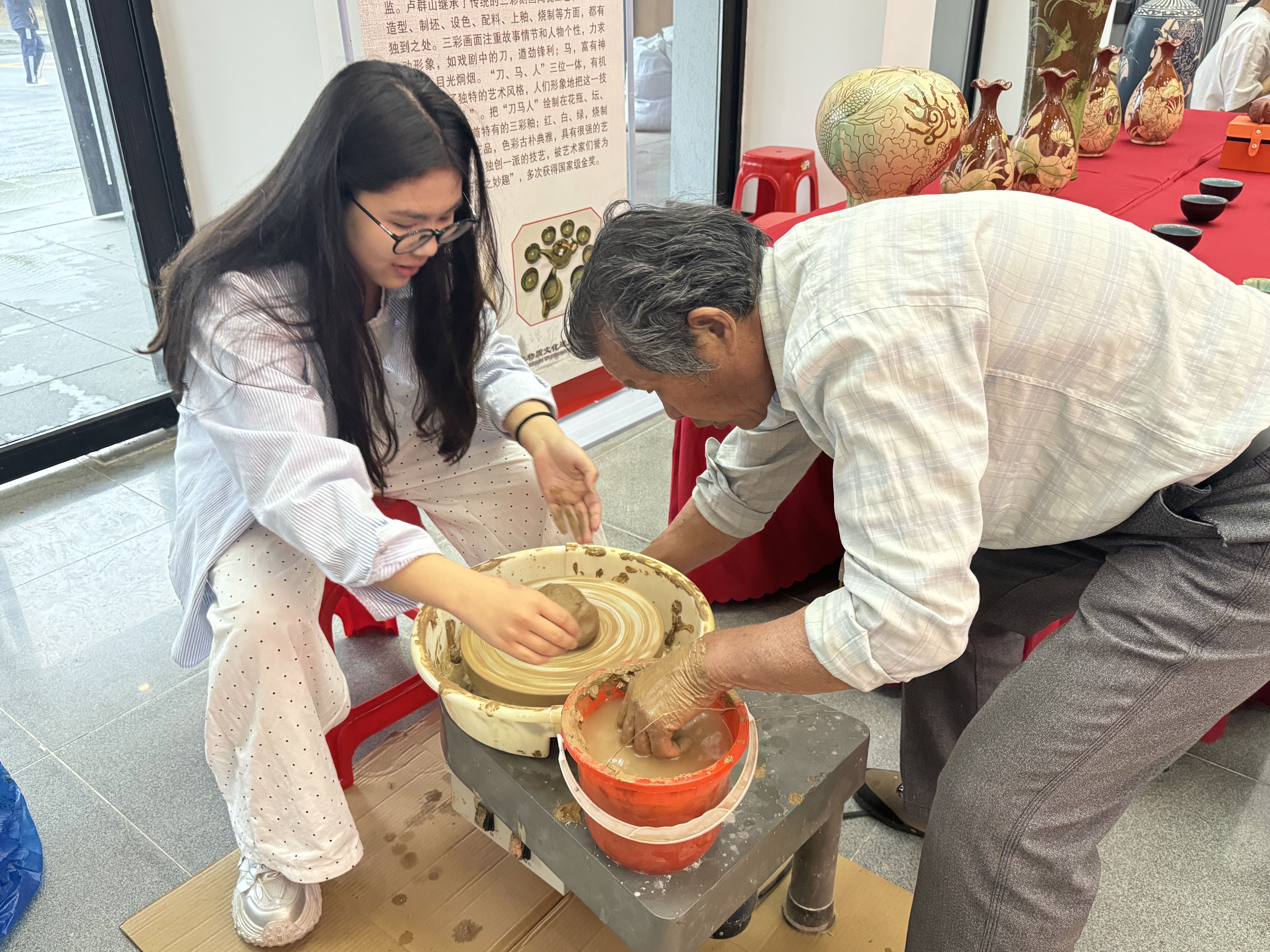 界首彩陶、歙砚、徽墨、纸笺加工技艺、宣笔、阜阳剪纸、界首木板年画、临淮泥塑、泾县油布伞……当天下午,12位国家级、省级非遗项目代表性传承人受邀带着各自的“绝技”走进学院,在校内摆开展位。学生们围聚在传承人周围,聆听非遗项目背后的故事、了解其中制作工艺、动手参与体验,在交流互动中感受非遗的独特魅力。