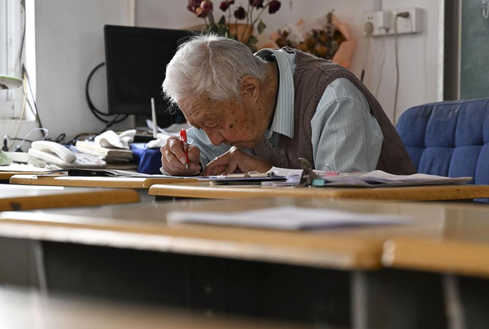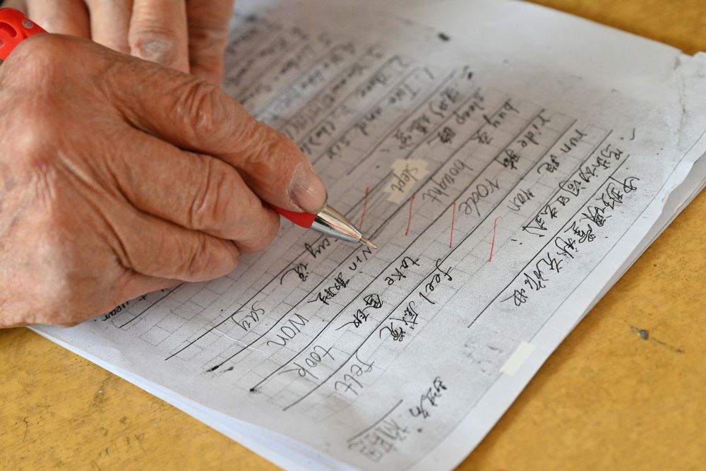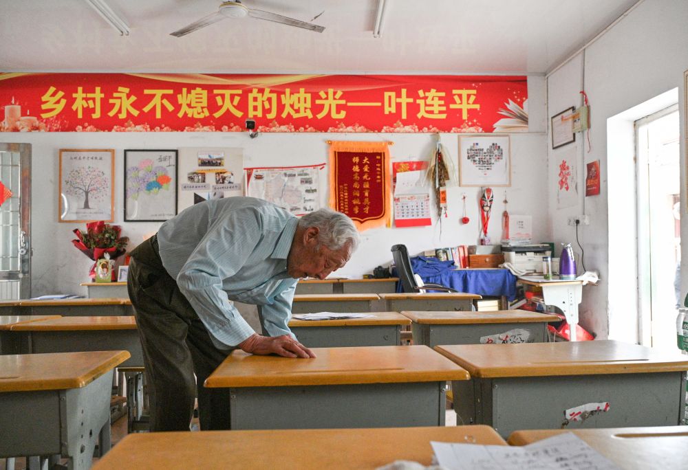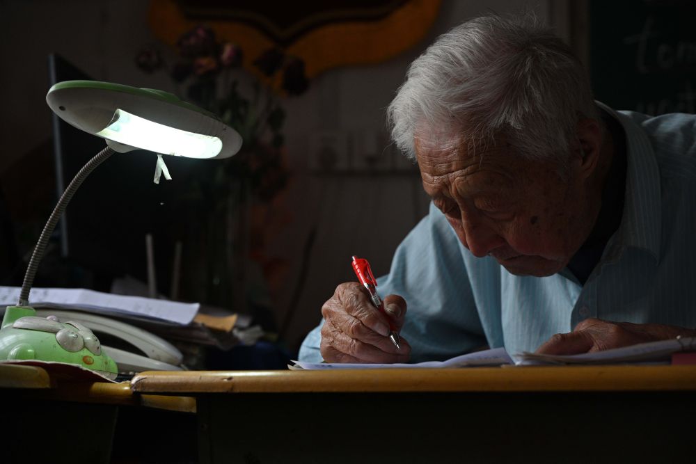 ↑4月9日,叶连平在卜陈村“留守未成年人之家”批改学生作业。由于视力下降,他批改作业时眼睛离桌面很近才能看清。