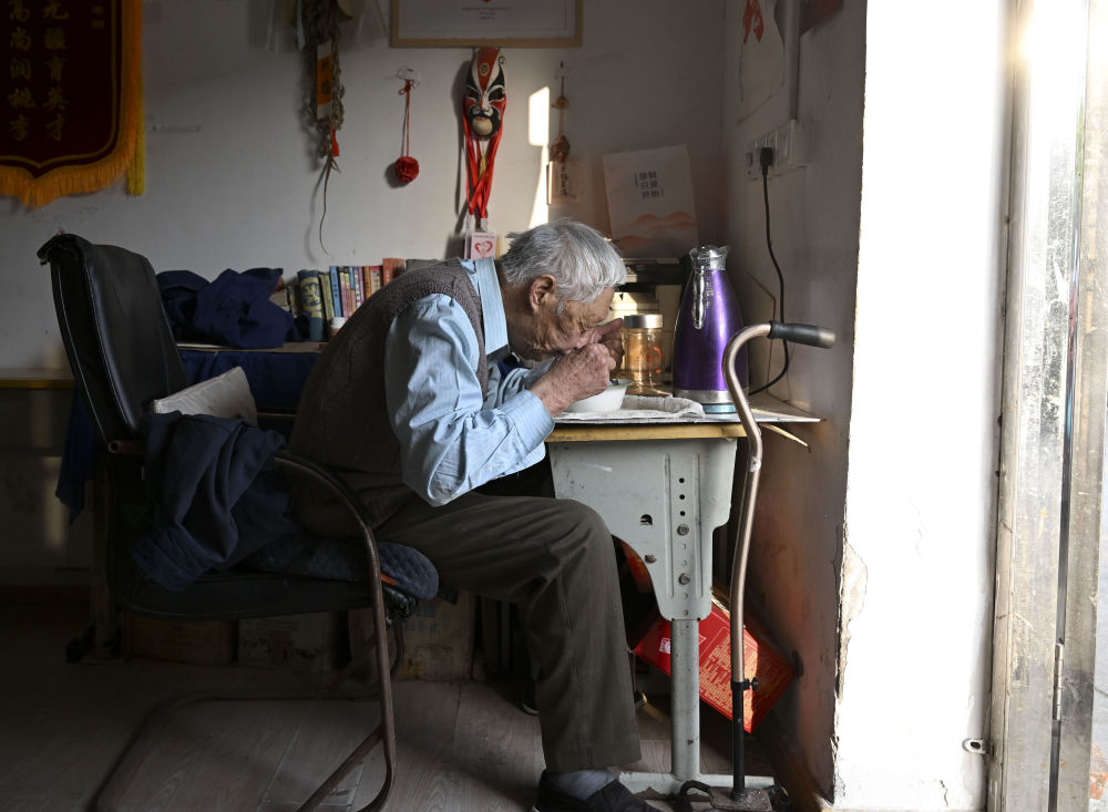 ↑4月9日清晨,叶连平在卜陈村“留守未成年人之家”吃早饭。
