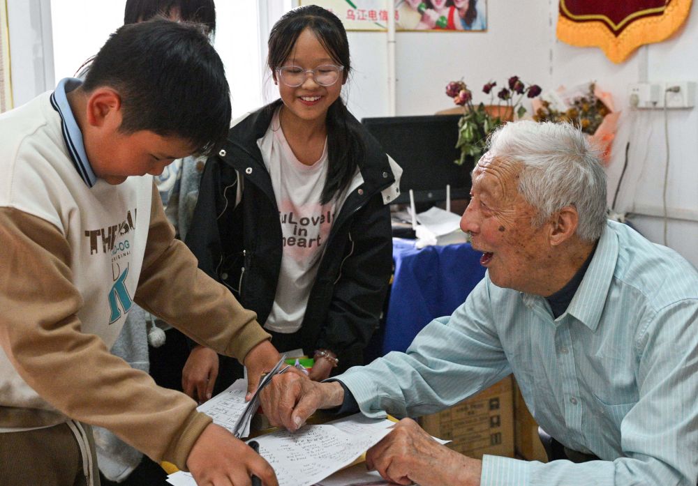 ↑4月9日,叶连平在卜陈村“留守未成年人之家”批改学生作业。