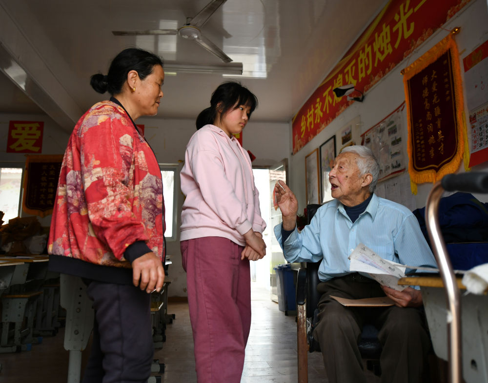 ↑4月9日,叶连平与前来了解孩子学习情况的家长(左)交流。