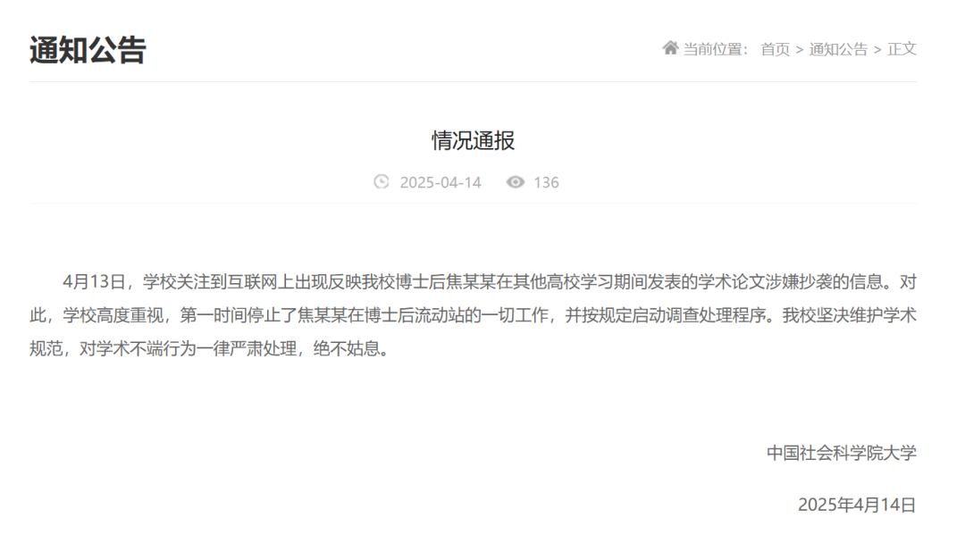 4月13日,学校关注到互联网上出现反映我校博士后焦某某在其他高校学习期间发表的学术论文涉嫌抄袭的信息。对此,学校高度重视,第一时间停止了焦某某在博士后流动站的一切工作,并按规定启动调查处理程序。我校坚决维护学术规范,对学术不端行为一律严肃处理,绝不姑息。