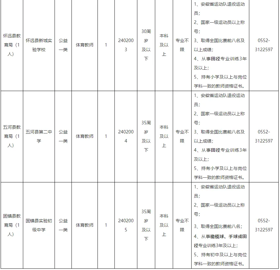 公告显示,蚌埠市2024年度第二批面向我省退役运动员公开招聘体育教师5名(具体招聘岗位、条件详见下表)。