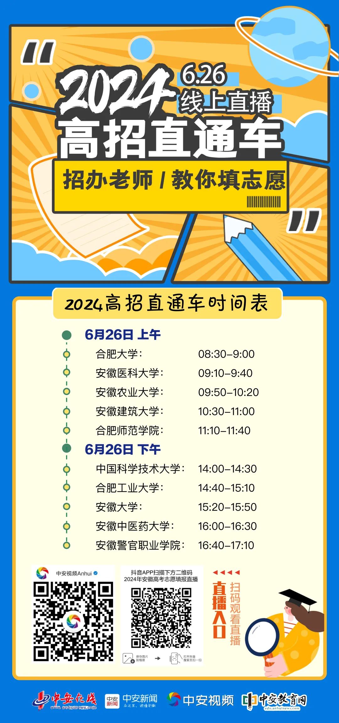 6月26日,中安在线将于8:30至17:10开通“高招直通车”线上直播,邀请中国科学技术大学、合肥工业大学、安徽大学、安徽医科大学、安徽农业大学、安徽建筑大学、安徽中医药大学、合肥大学、合肥师范学院、安徽警官职业学院等10所高校招生办老师做客直播间,指导考生如何填报志愿。