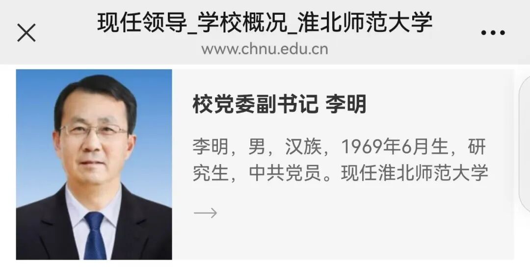 近日,淮北师范大学官网“现任领导”一栏更新后显示,李明已任淮北师范大学党委副书记。