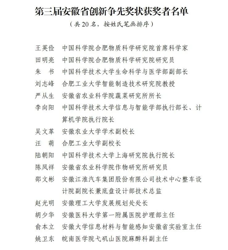 为进一步表彰我省在面向世界科技前沿、面向经济主战场、面向国家重大需求、面向人民生命健康和社会服务等相关科技创新领域作出突出贡献的个人和集体,省人力资源和社会保障厅、省科学技术协会、省科学技术厅、省人民政府国有资产监督管理委员会决定,授予极端压力容器设计制造与维护创新团队等5个团队第三届安徽省创新争先奖牌,授予冯守中等5名同志第三届安徽省创新争先奖章,授予王英俭等20名同志第三届安徽省创新争先奖状。