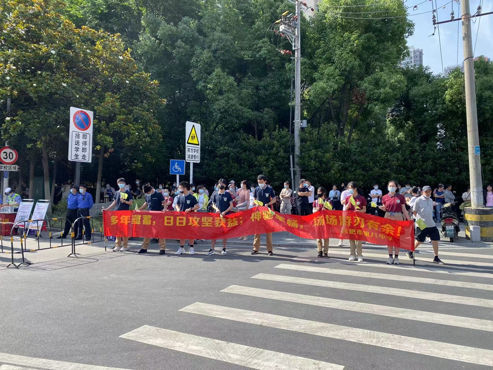 “同学加油,考出好成绩!”合肥五十中天鹅湖校区外,合肥八中学生志愿者为本届考生呐喊助威。