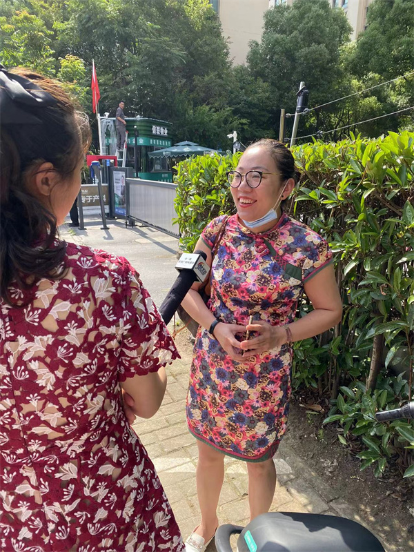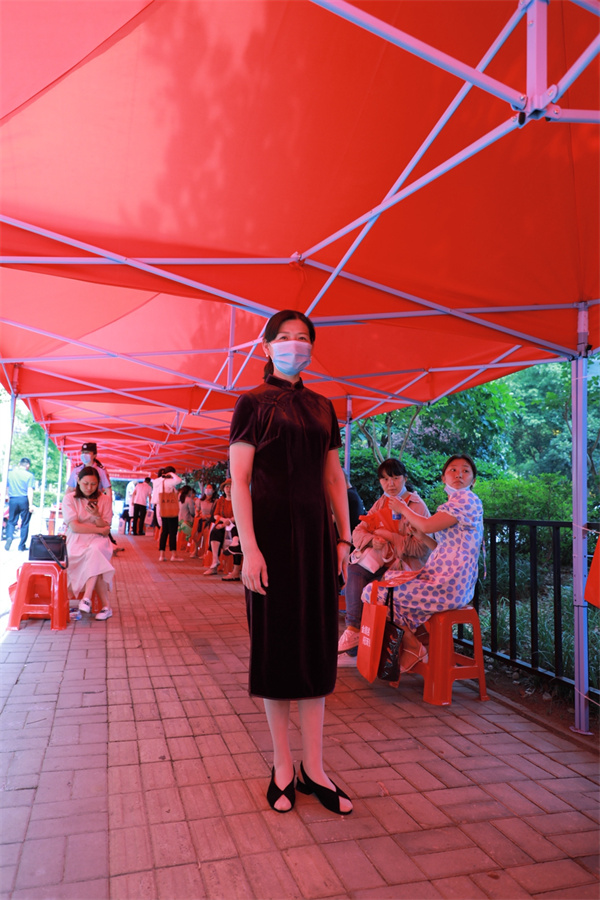 在合肥168学校考点外,很多送考家长身穿旗袍送考,预祝学子们“旗开得胜”。