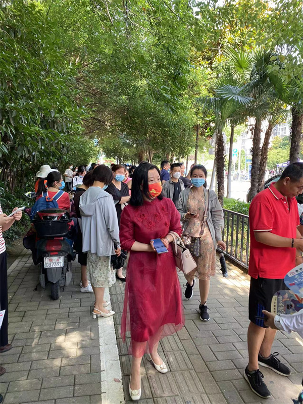 合肥九中考场一家长穿旗袍手拿向日葵,祝孩子高考旗开得胜,一举夺魁。