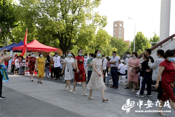 合肥五十中天鹅湖校区外不少家长身穿旗袍为考生加油,寓意“旗开得胜”。
