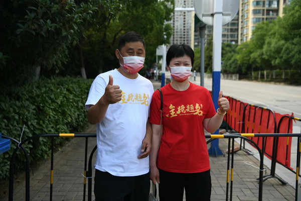 合肥八中考场,一对考生父母定制了“送考服”,祝愿自己的孩子“金榜题名”。