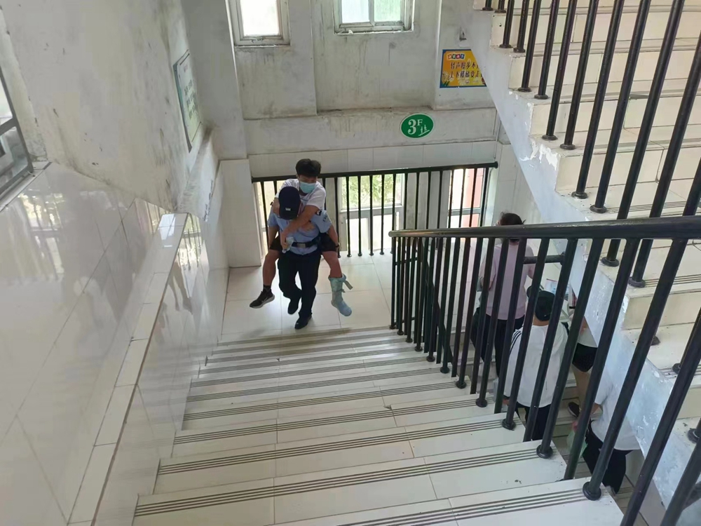 6月7日上午,肥西县实验高中考点,有一名脚部骨折的考生。为了让考生能够顺利上“战场”,现场执勤民警按照政策为其开启“绿色通道”,让该名考生提前进入考场,上楼梯时,执勤警力背起考生将其送到座位上。