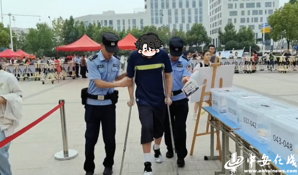 高新分局蜀麓派出所在七中考点服务考生,把一名腿部受伤的考生扶入考场。