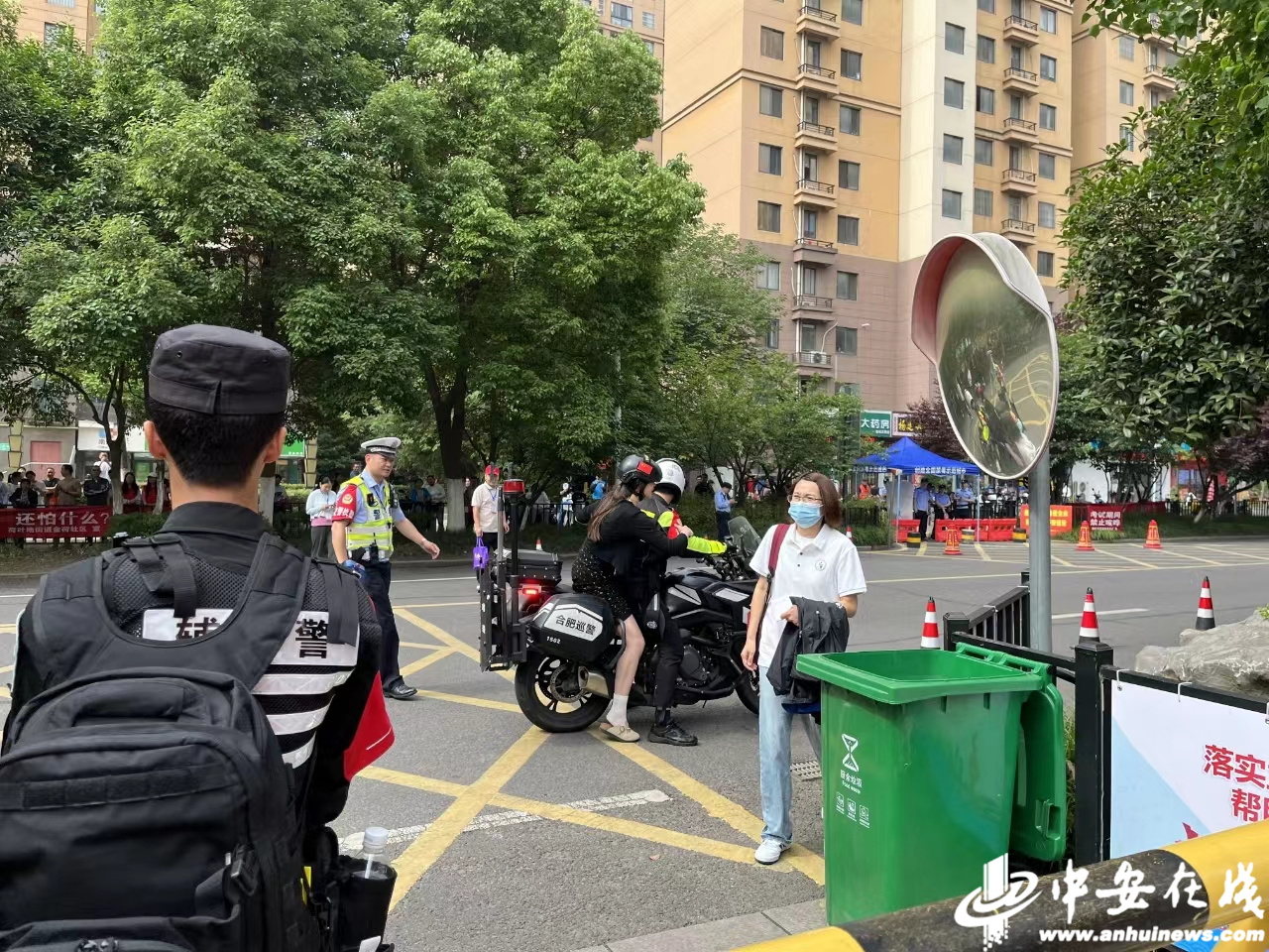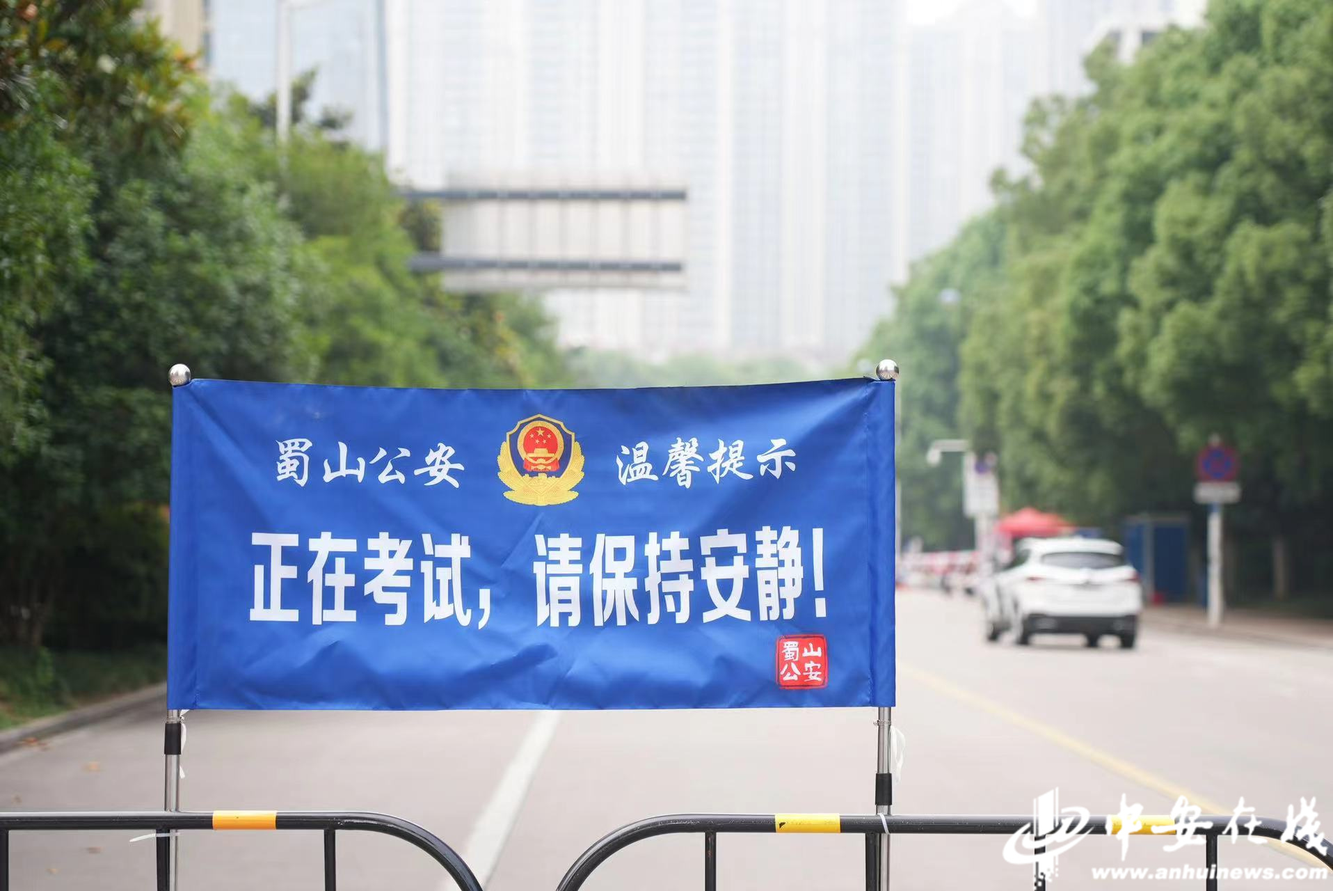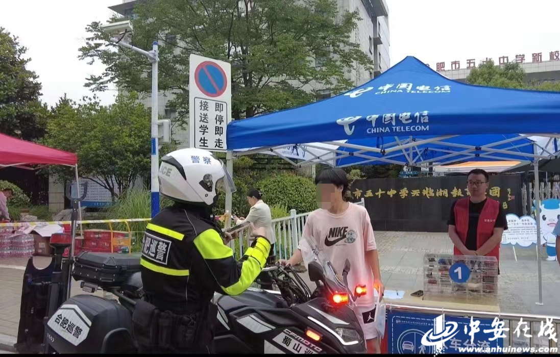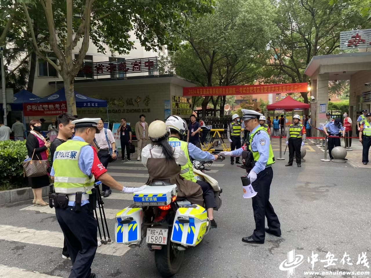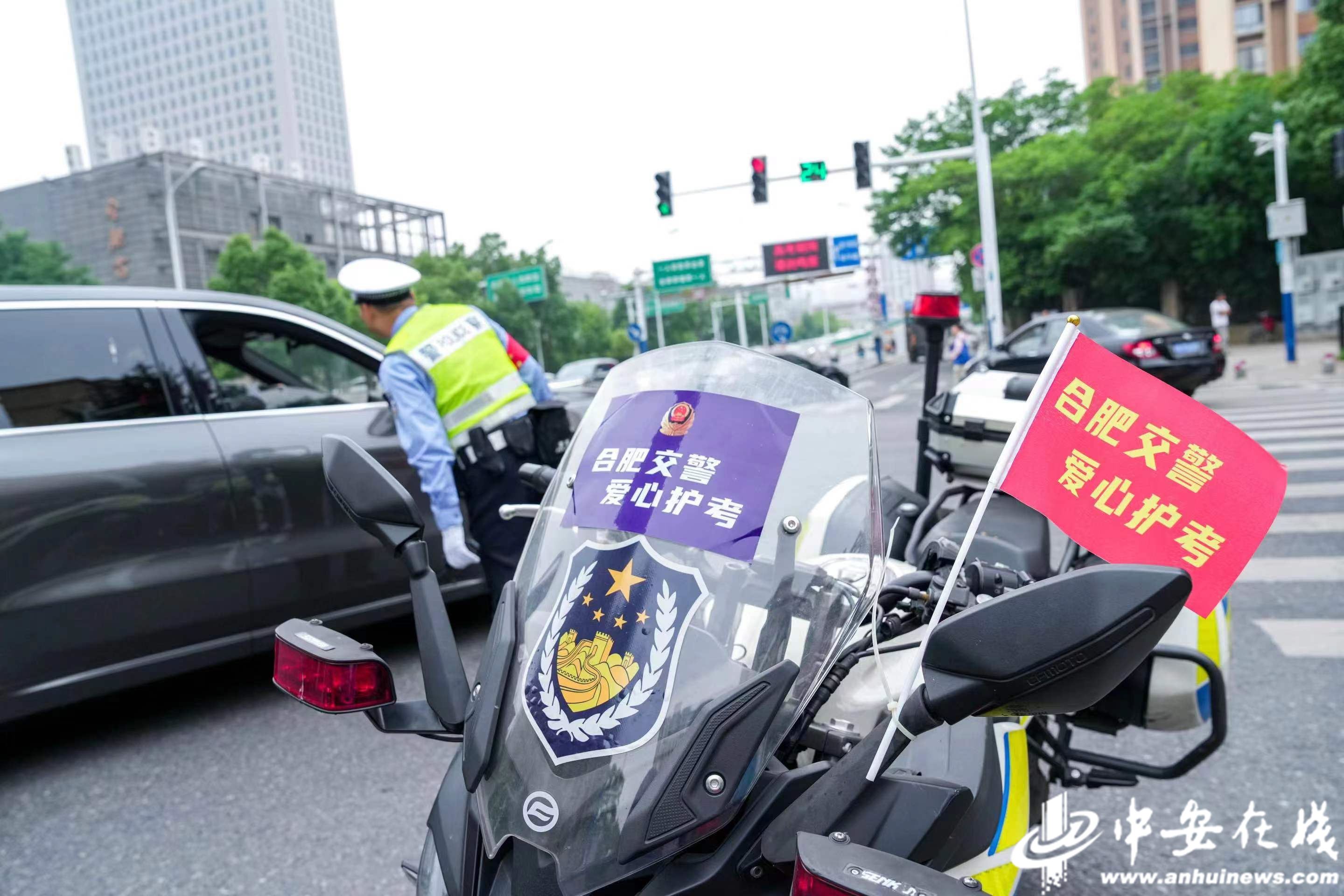 合肥市蜀山区五十中学天鹅湖教育集团蜀外校区,交警维持现场秩序护航高考。(通讯员 葛庆钊)