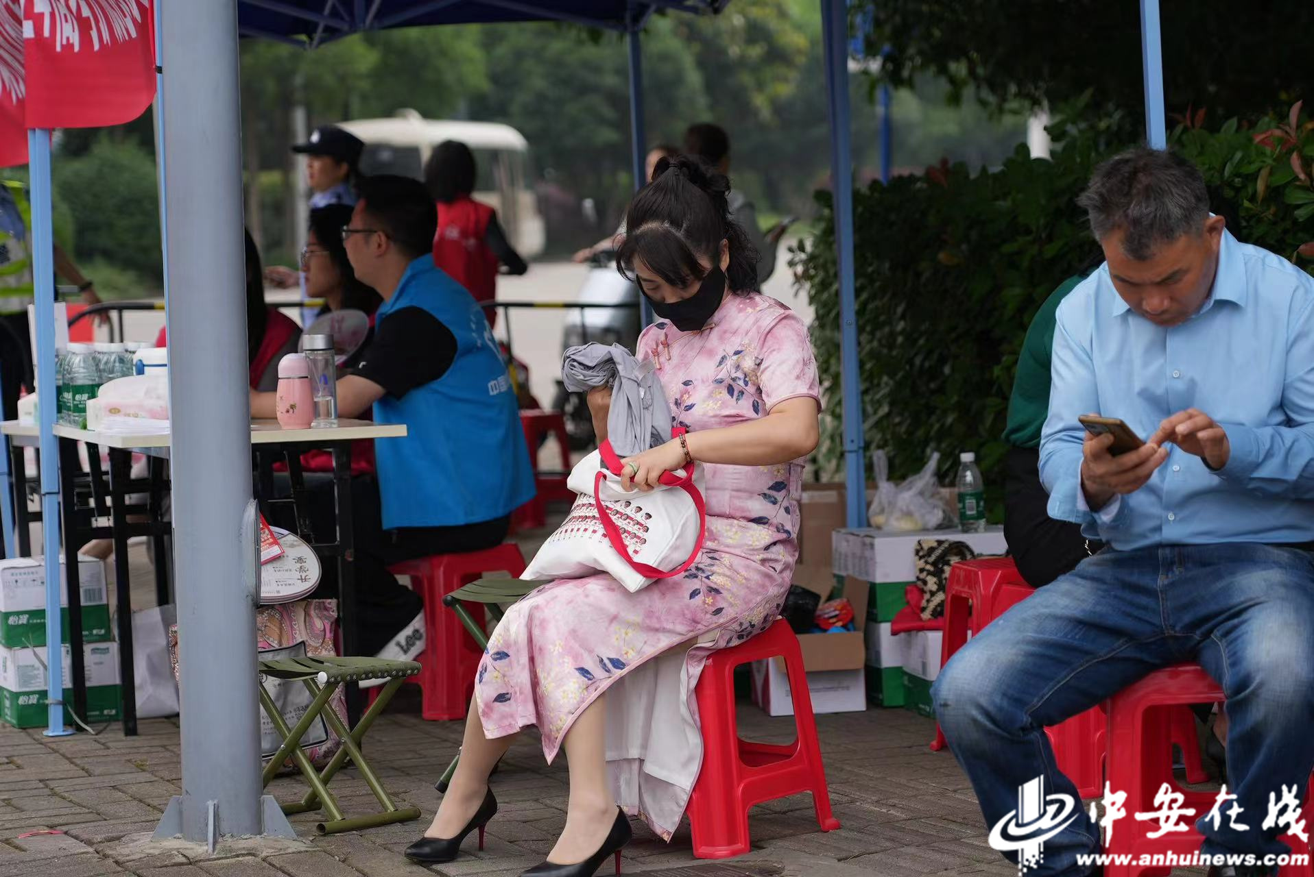 考场外一位身穿旗袍的家长正在等待考试结束。