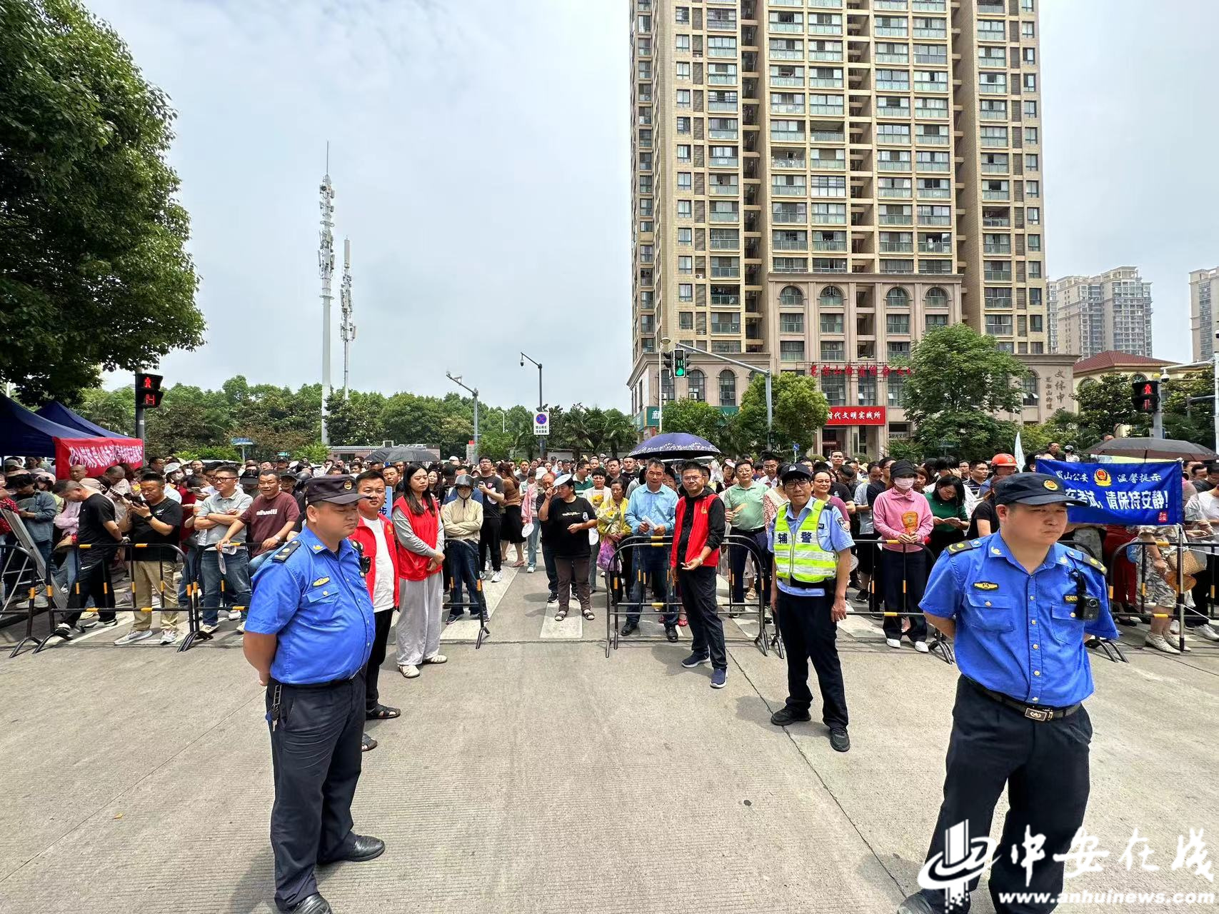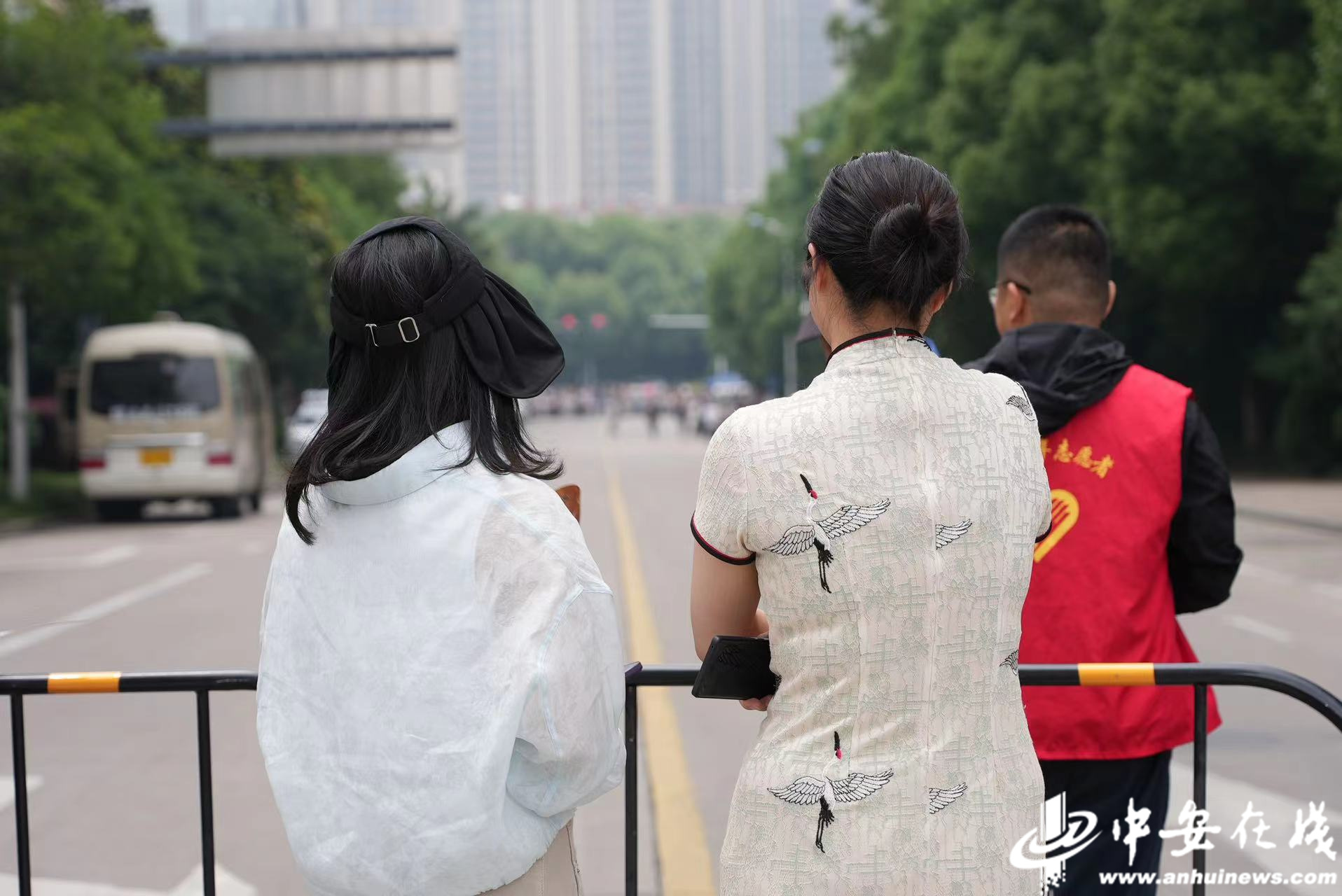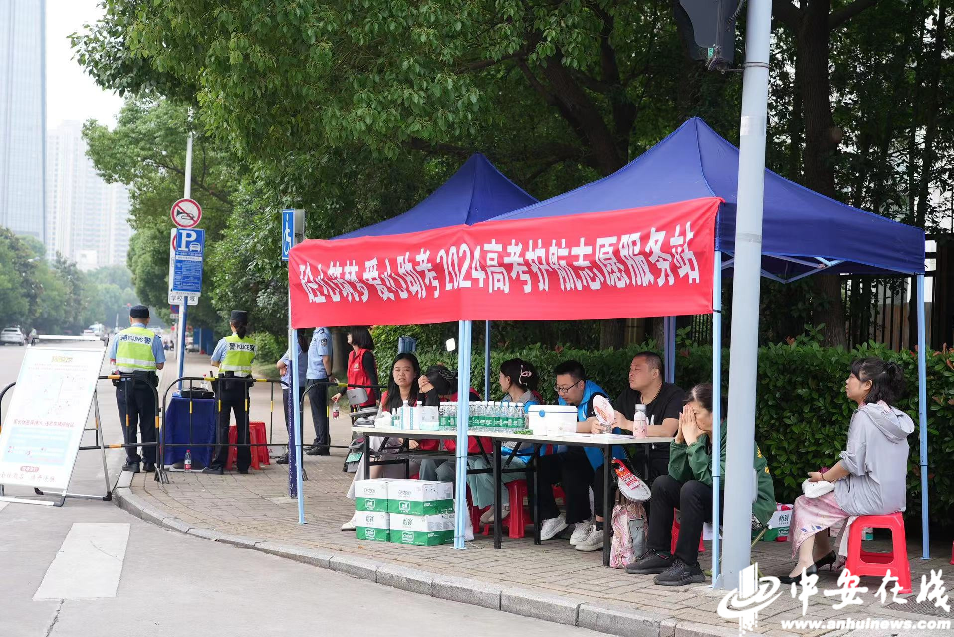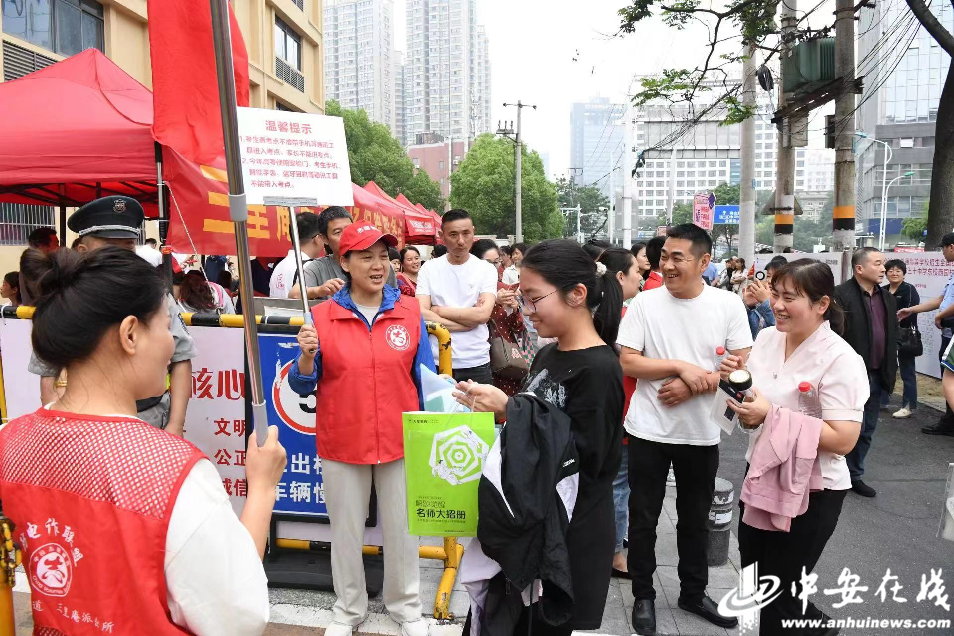 在合肥市五十中东校教育集团西园校区考点,蜀山区三里庵街道竹荫里社区的志愿者在现场帮助维持秩序、为送考家长送水,全力护航高考。(通讯员 陈三虎)