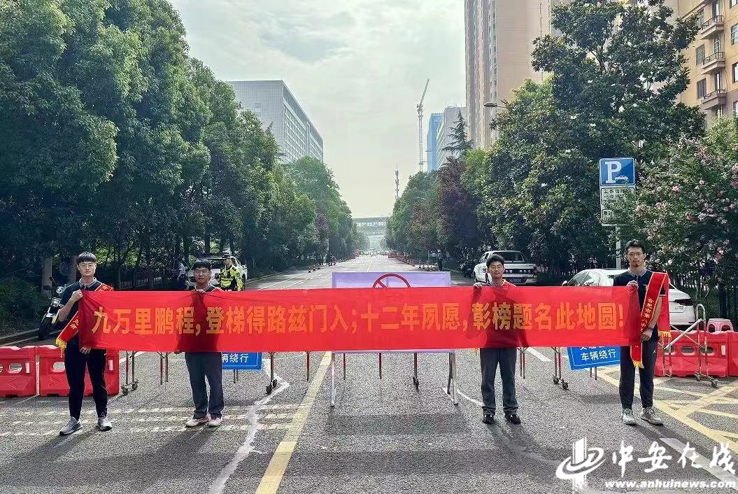 合肥市五十中学天鹅湖教育集团蜀外校区,来自合肥八中的学弟学妹为高考考生加油助威。(通讯员 葛庆钊)