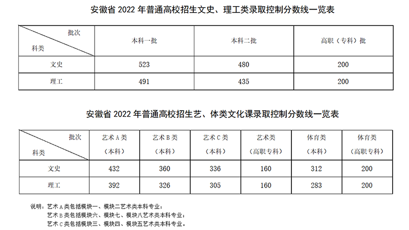据了解,今年安徽高考录取各批次最低控制分数线如下,文科:一本523分,二本480分,高职200分。理科:一本491分,二本435分,高职200分。