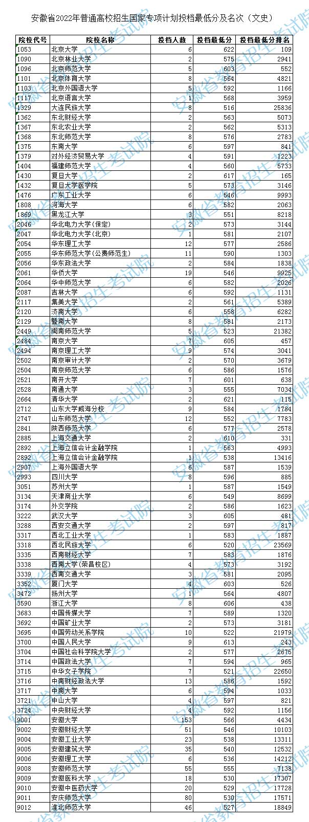 安徽省2022年普通高校招生国家专项计划投档最低分及名次(文史)