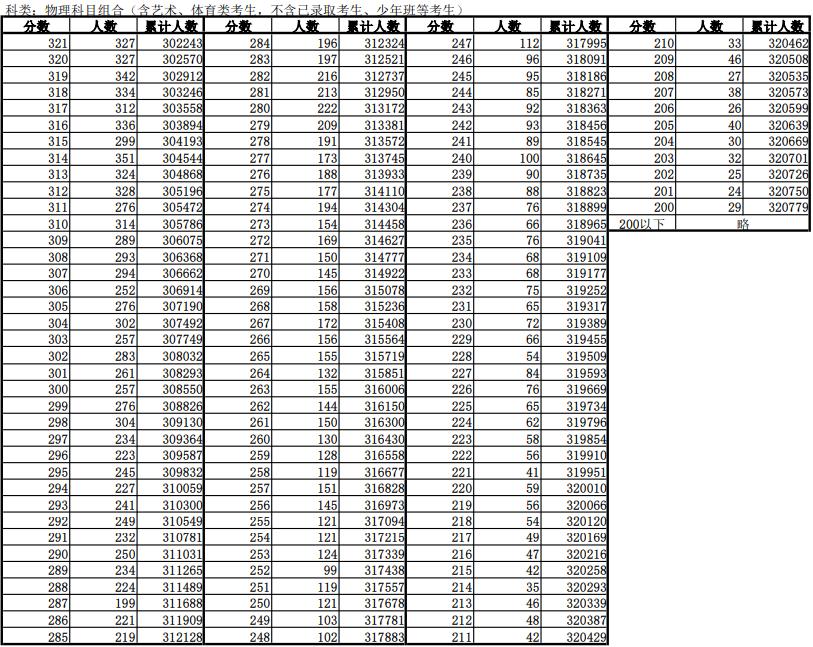 物理科目类分段表(含加分)(含艺术、体育类考生,不含已录取考生、少年班等考生)650分以上的考生4149人,物理类本科录取线461分以上191416人。