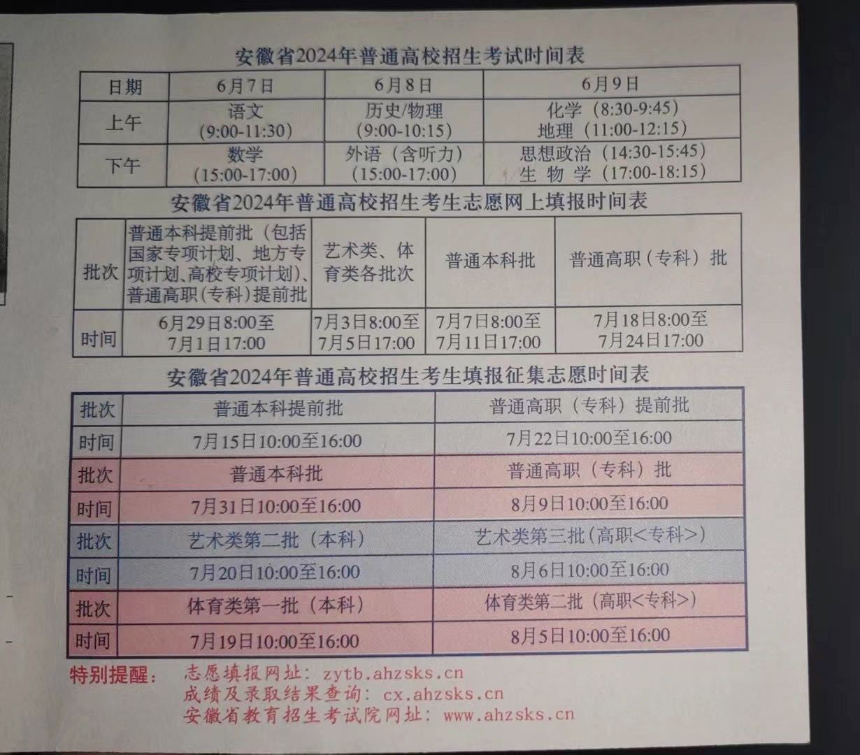 中安在线、中安新闻客户端讯 记者从教育部门获悉,安徽省2024年普通高校招生将于6月29日开始首次网上填报志愿,征集志愿将于7月15日开始,具体安排如下: