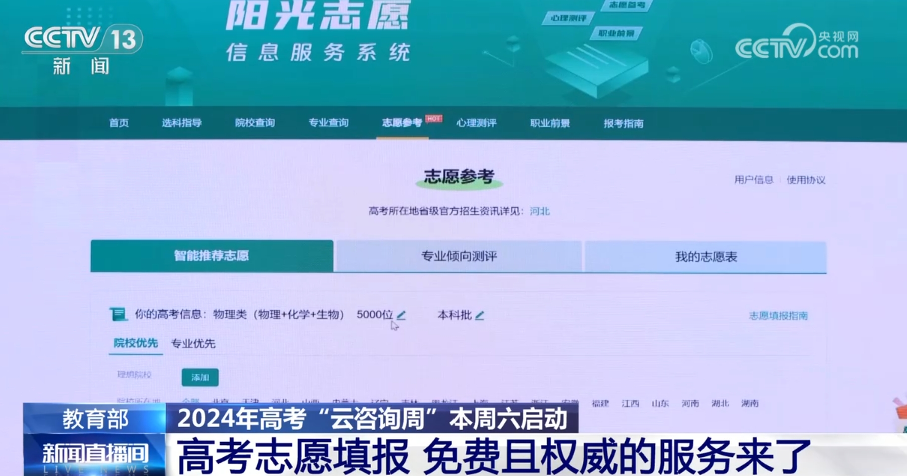今年平台推出免费的“阳光志愿”信息服务系统,考生可通过系统事先对高校的专业培养、就业方向、职业发展等有关信息进行全方位了解,增加咨询的针对性和效率。考生可通过教育部“阳光高考信息平台”网页、“阳光高考信息平台”微信公众号、“阳光高考”百度小程序等参与咨询周活动,了解有关高校的视频直播活动安排。