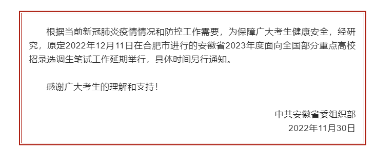 根据当前新冠肺炎疫情情况和防控工作需要,为保障广大考生健康安全,经研究,原定2022年12月11日在合肥市进行的安徽省2023年度面向全国部分重点高校招录选调生笔试工作延期举行,具体时间另行通知。