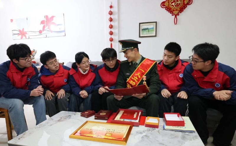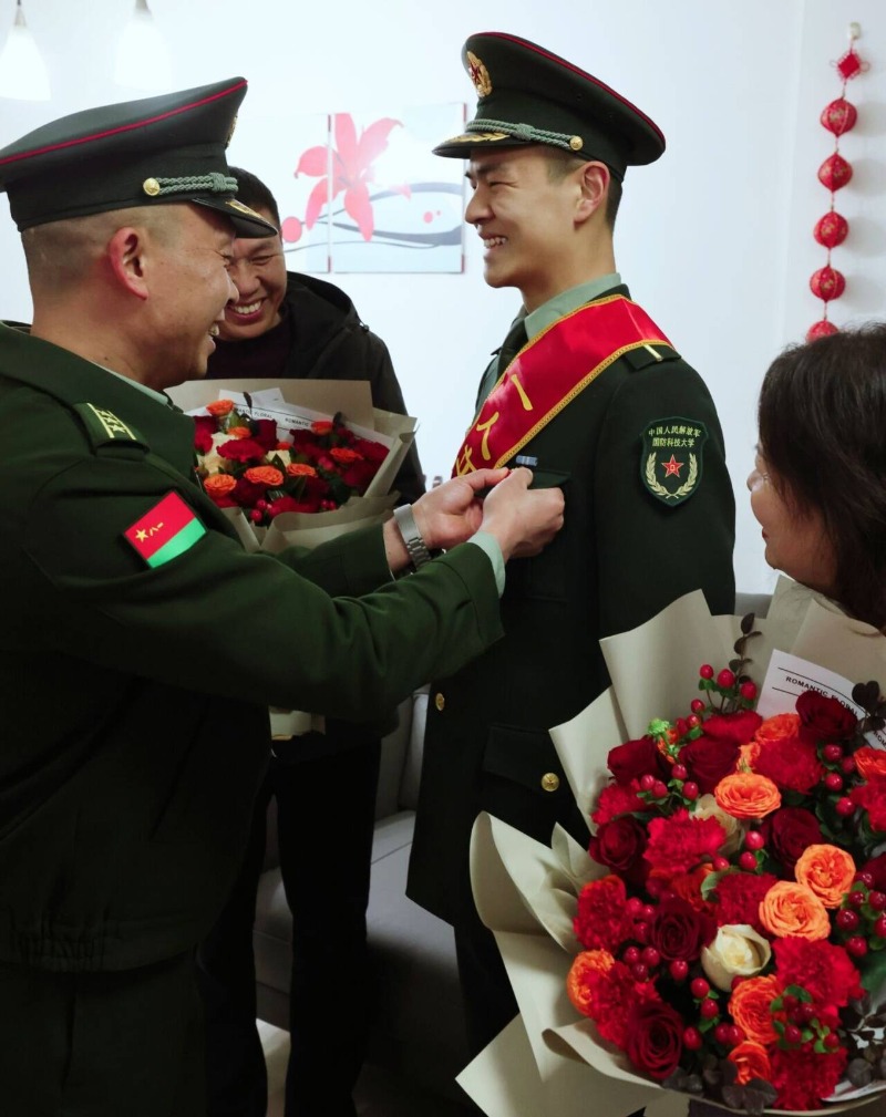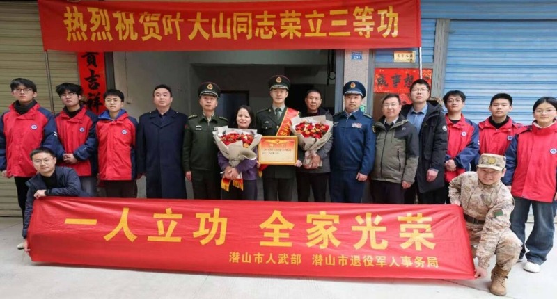 2025年2月11日,潜山市梅城镇,军校学员叶大山家庭迎来了一份特殊的惊喜。当天上午,当地政府部门和人武部领导及潜山野寨中学师生代表为他送来个人三等功的喜报。
