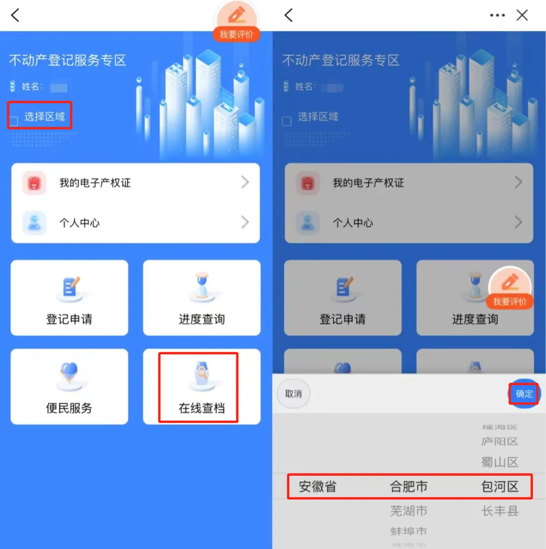 进入“不动产登记服务专区”后首先选择您所在的区域,以合肥市包河区为例,选择区域后,点击“在线查档”。