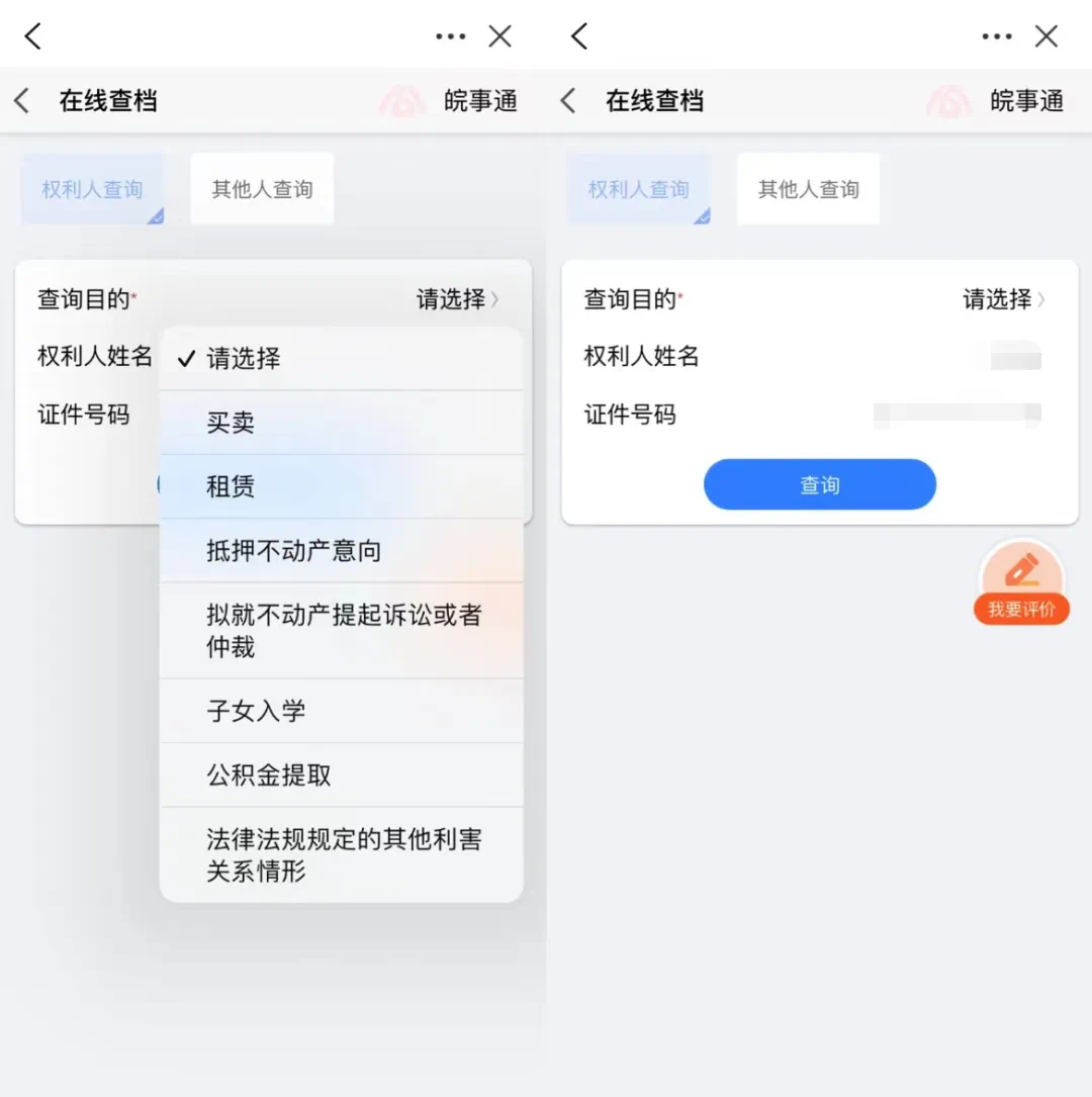 进入“在线查档”页面后,根据实际情况选择“查询目的”,并点击“查询”。