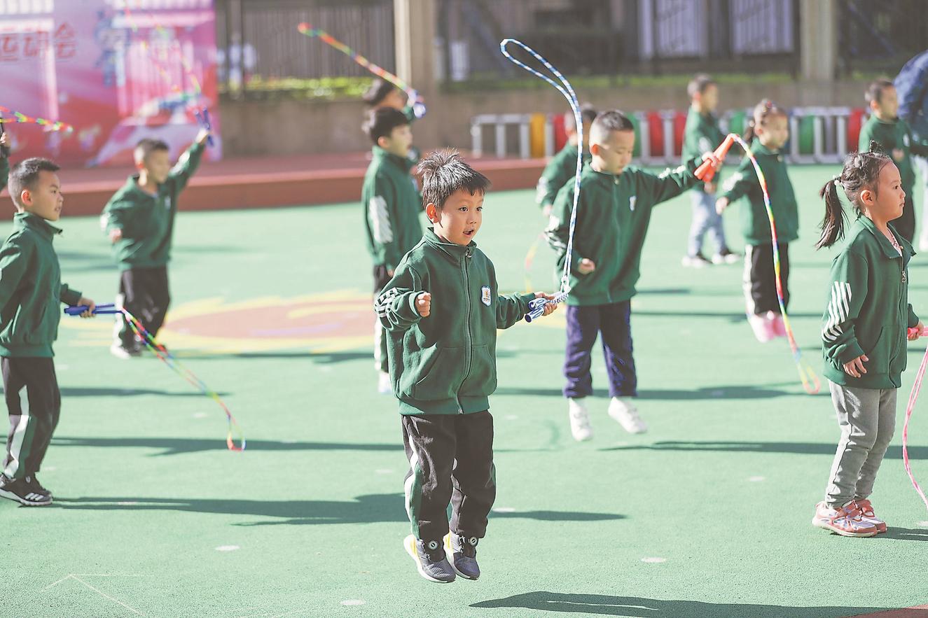 日前,铜陵市时光街幼儿园的孩子们正在进行跳绳操训练。本年度,铜陵市在各区提高学前教育体育课程占比,推广适合幼儿年龄特点的跳绳操、武术教学等方式,让孩子们在享受运动乐趣的同时,达到以体健身、以体启德、以体益智的目的。