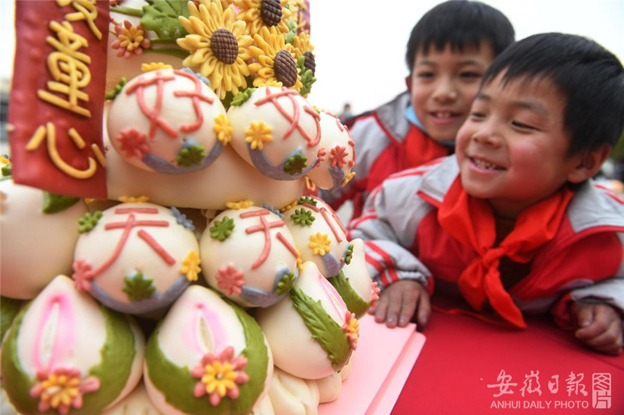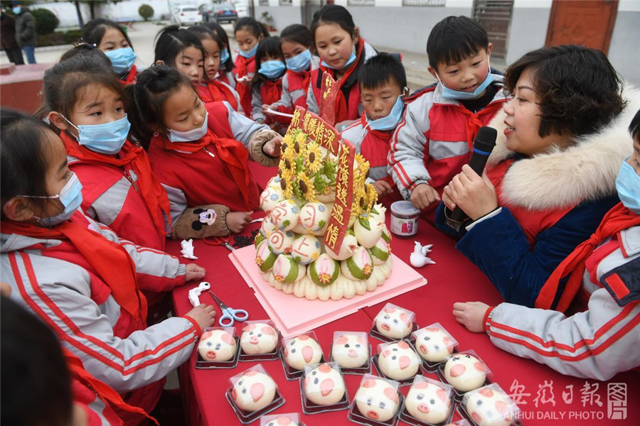 12月17日,阜阳市关爱“三留守”志愿者协会开展“非遗花馍进校园、感受指间美食魅力”主题活动,邀请本市太和县民间手工艺人李雪艳,带上制作的“馍暖情深”花馍作品来到太和县赵集乡齐老营小学,向小学生们展示和传授县级非物质文化遗产“花馍”技艺,让孩子们从小接受传统文化的熏陶,激发了他们热爱家乡、弘扬和传承传统文化的兴趣。特约摄影 王彪
