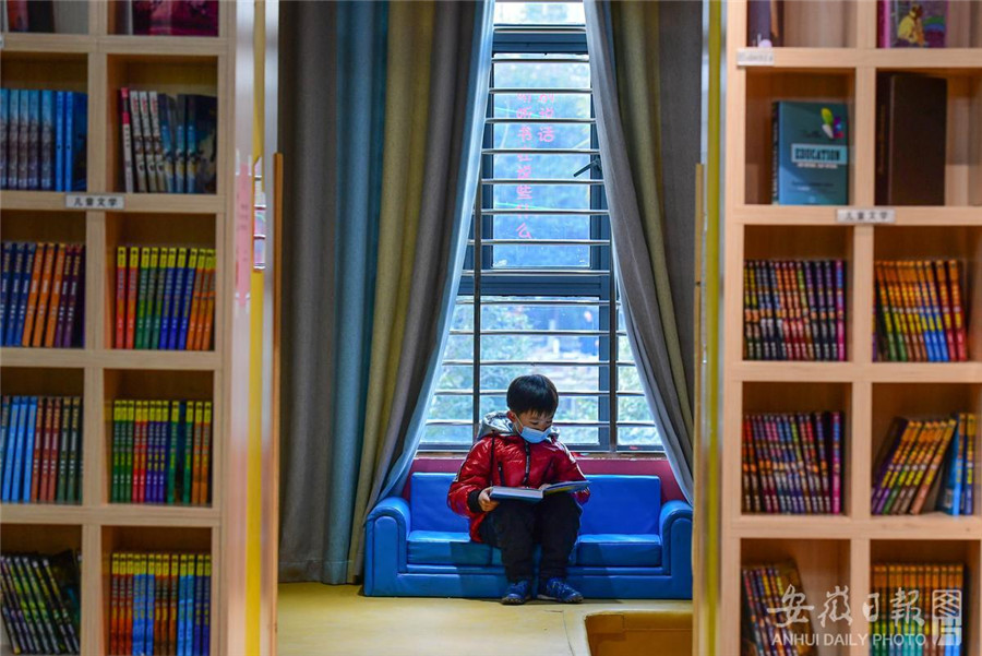 2021年1月2日,元旦假日期间,肥西县上派镇许多居民带着孩子走进社区书吧和图书馆看书阅读,乐享书香假日。通讯员 徐勇 摄