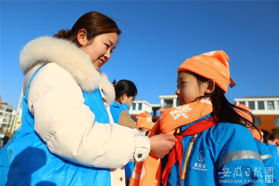 1月8日,安徽省淮北市蒲公英公益协会的志愿者来到烈山区烈山镇中心学校,为乡村孩子们发放包括棉衣、帽子、围巾、棉鞋、书包等物品的壹基金“温暖包”,让孩子们在寒冬时节感受温暖。通讯员 万善朝 摄