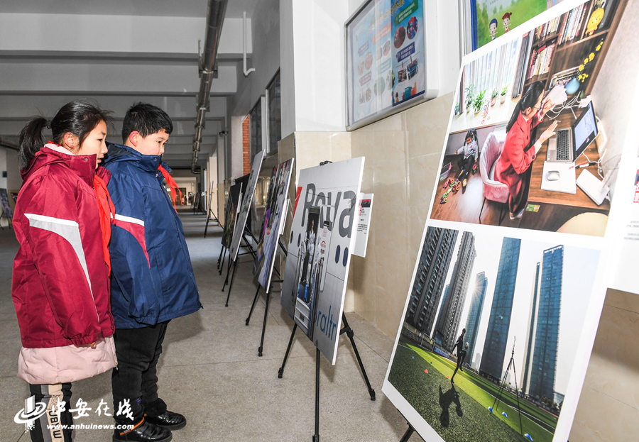 合肥市师范附属小学,小学生正在观看“抗疫影像”主题摄影展